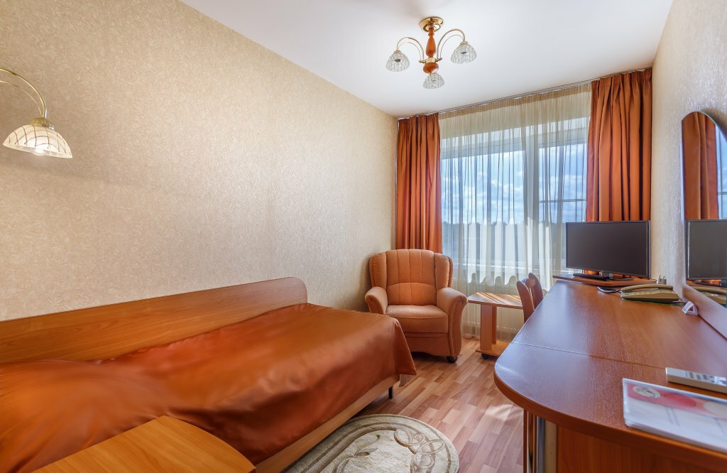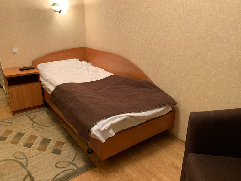 Была дважды, бронировала комфорт и стандарт. В комфорте мебель новее, матрас неудобный, двуспальная кровать, которую с легкостью можно разделить на две односпальные. В стандарте кровать полуторка, матрас моя спина оценит ила выше. Мебель не новая, но не битая. Душевая маленькая и там и там, отличается наличием шторки или стеклянной перегородки. В целом для этого класса гостиница достаточно устрашающий не плохая. На 8 этаже ресторан.