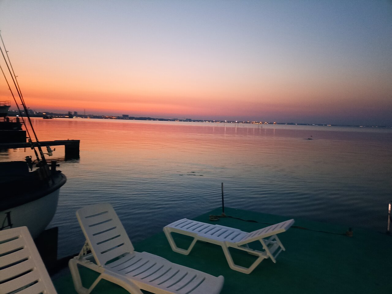 Добрый день! Незабываемые впечатления. Чистое море, уютный, просторный номер с балконом с видом на море, отзывчивые гостеприимные хозяева. Все шесть дней что мы были, один раз были небольшие волны, но это не мешало нам купаться. Заходить в воду с пирса по лестнице. Вкусная домашняя кухня с питанием на свежем воздухе. Людей не много. Многообразный морской мир наших мальчиков приводил в восторг. В бухте ветра почти не чувствуется. А на рассвете и закате фото шикарные. Дно каменное, местами мелкогалечное. В шаговой доступности древняя крепость, древние храмы и магазины. Нам очень понравилось, обязательно приедем не один раз.