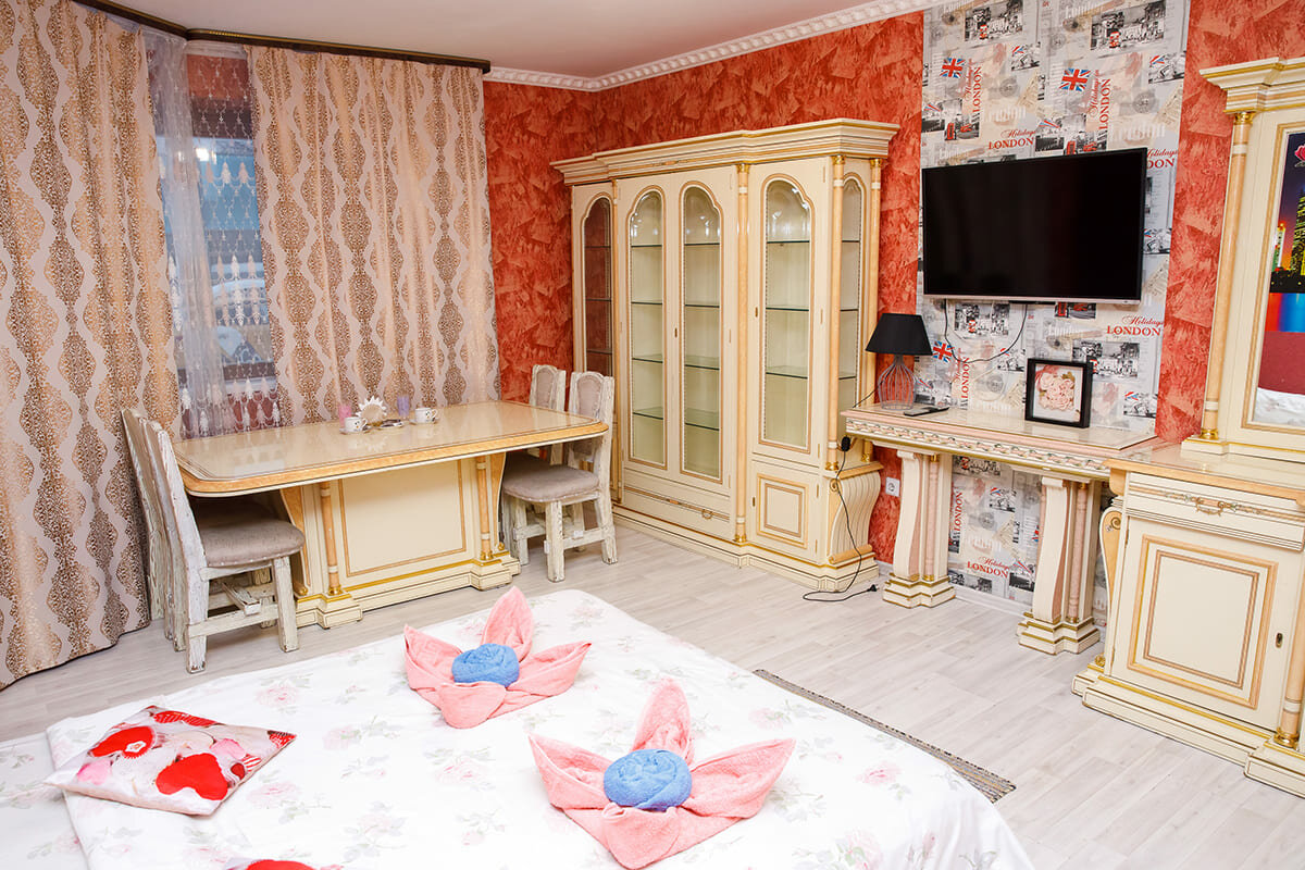 Стоимость 1 часа - 800 рублей.Стоимость проживания за ночь - 3500 рублей.Выезд до 12:00.Поздний выезд или ранний заезд обсуждаются индивидуально.При бронировании номера более, чем на 3 ночи - скидка!!!Номер мебелирован большой двуспальной дуб...