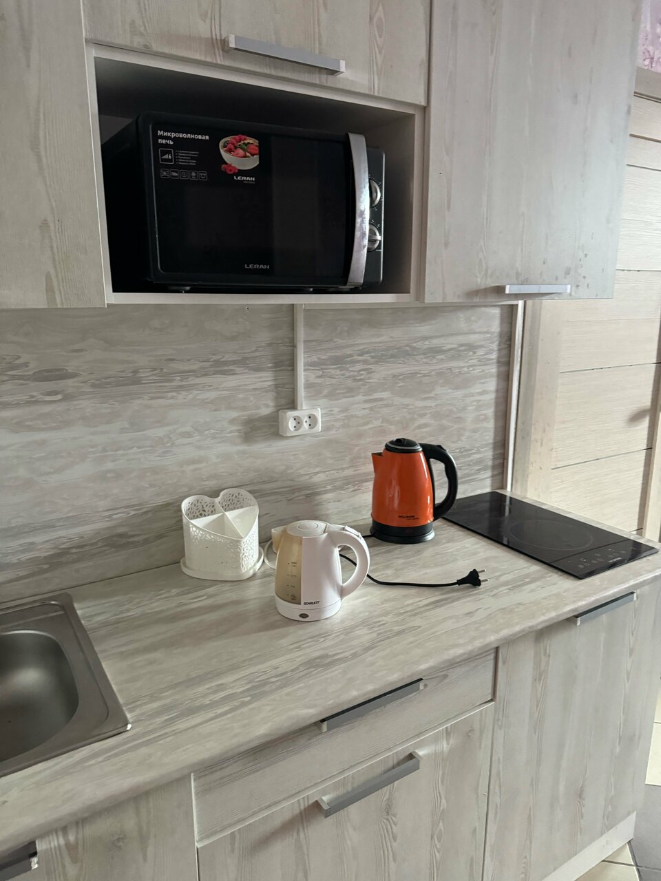 - Есть чайник, микроволновка, холодильник, посуда, плита.