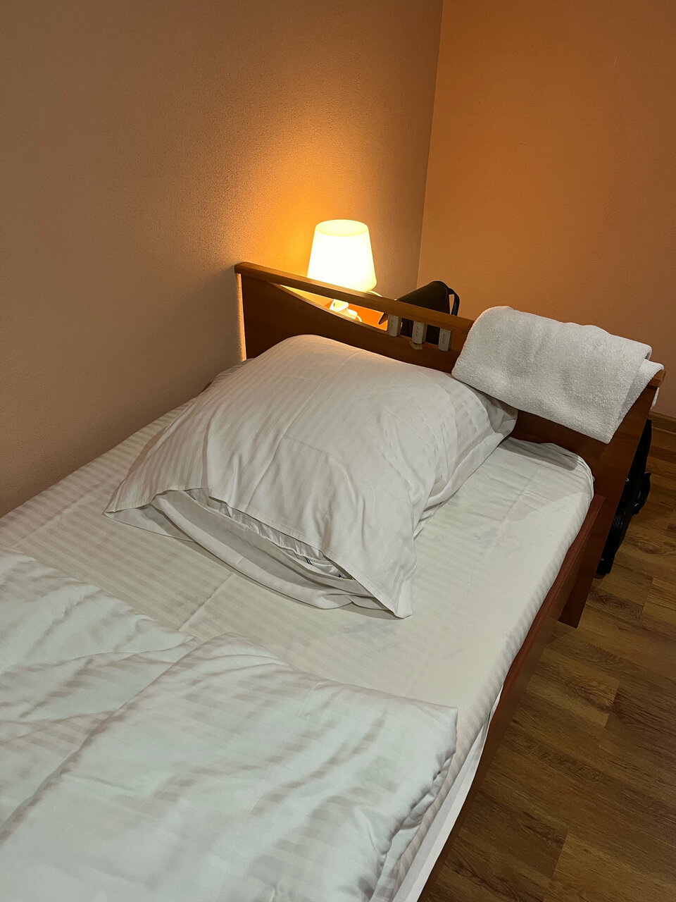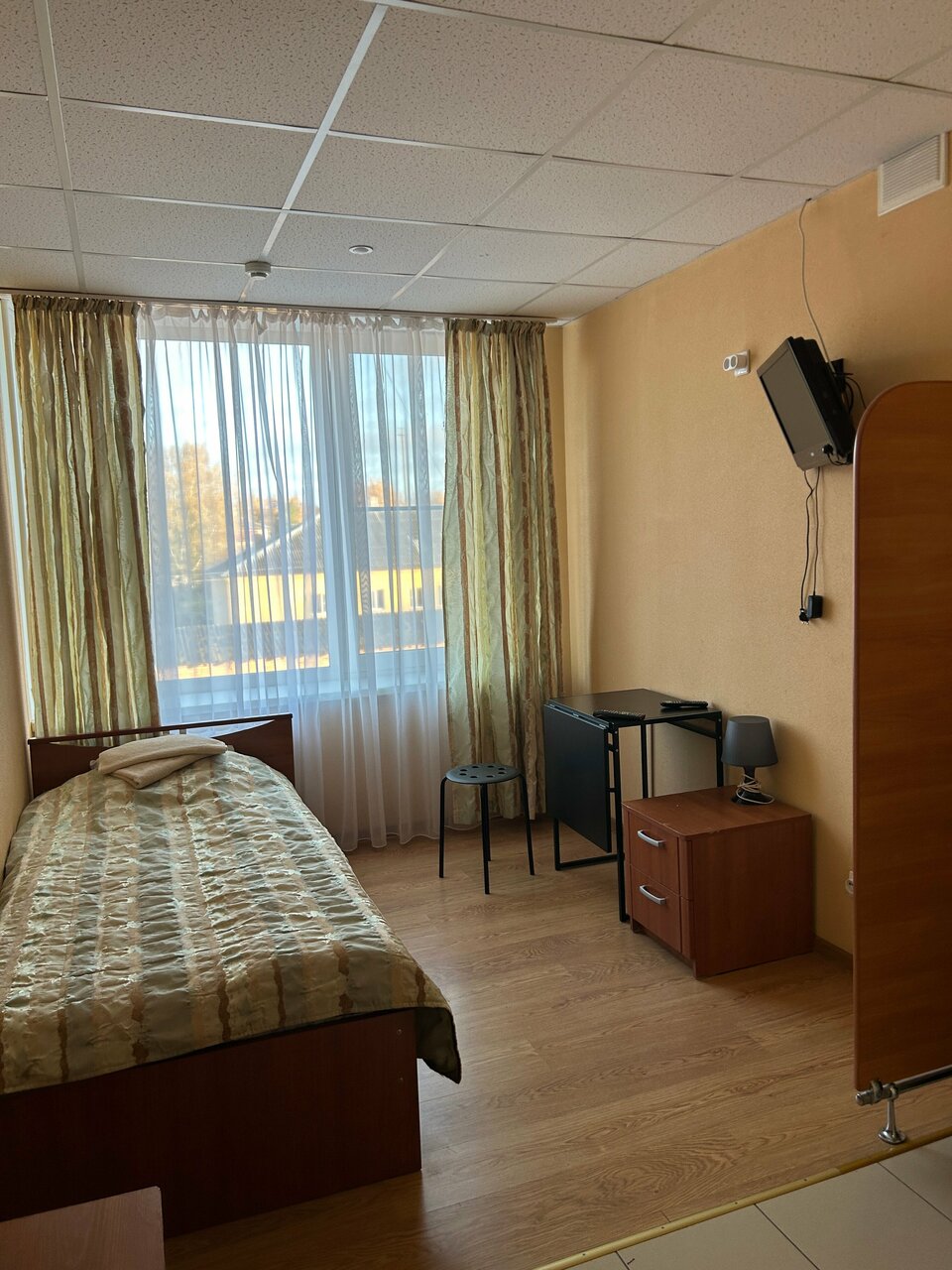 Душ и сан/узел в номере, одна односпальная кровать, жк-тв, полотенце, стол, стул, зеркало.Площадь номера 12 м².Номер для 1 гостя.