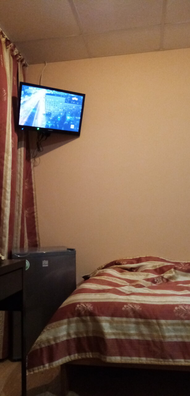 Душ и сан/узел в номере, одна кровать, жк-тв, полотенца, стол, стулья, зеркало, холодильник. Площадь номера 12 м².Номер для 1 гостя.
