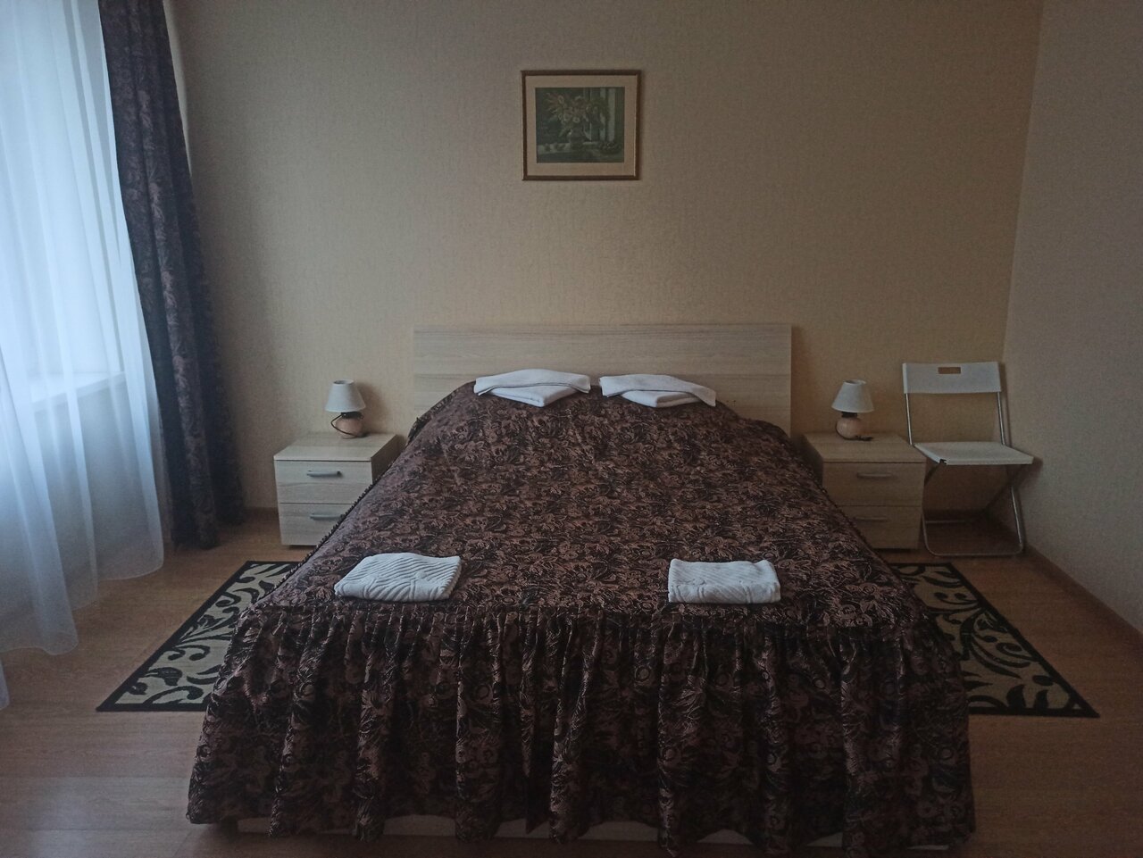 Душ и сан/узел в номере, одна двуспальная кровать, жк-тв, полотенца, стол, стулья, зеркало, холодильник. Площадь номера 14 м².Номер для 2 гостей.