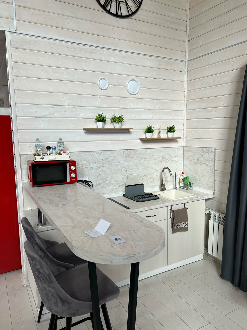 Для празднования дня рождения и размещения гостей мы выбрали Барнхаус и А-фрейм. Домики классные, стильные, современные, оборудованные всем необходимым. Бонусом идёт скидка на посещение бассейна под открытым небом с хаммамом и сауной. Праздничный банкет мы заказывали в кафе Good Food . И пока мы релаксировали в бассейне, ребята накрыли стол. Всё очень достойно и вкусно, оригинальные блюда, интересная подача. Нам всё понравилось Прекрасная получилась коллаборация, хорошая задумка! Огромное спасибо, что предоставляете возможность такого отдыха!