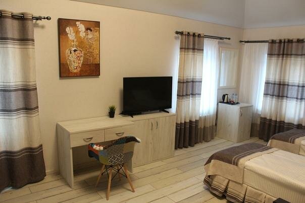 Чисто, уютно, тихо. Кровати удобные. Хороший завтрак, который почему то не был указан на островке. Заказываешь при заселение. И с утра помимо шведского стола выносят горячий завтрак. Полно размерный фен. Утюгс доской. Чайник. Расположен в спальном районе, вокруг частный сектор и пятиэтажки. До центра близко. Парковка еть. Отдельное спасибо за то, что согласились перенести дату заезда.