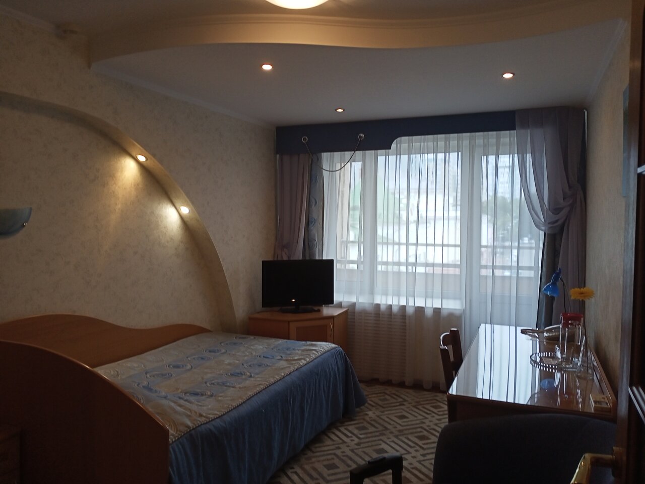Гостиница советского периода. Кондиционера нет. Хорошо что окно открывается. Был в сентябре в двадцатых числах. На улице 25 градусов в номере духота. Из приборов один стакан. Ванная очень маленькая 1 м. Когда моешся штора постоянно прилипает к телу. Раковина, как будто для ребенка. Одну ночь переночевать можно. Из достоинств цена 2800 р. И возможна оплата половина суток. Да и ещё рядом не плохой сквер на берегу реки.