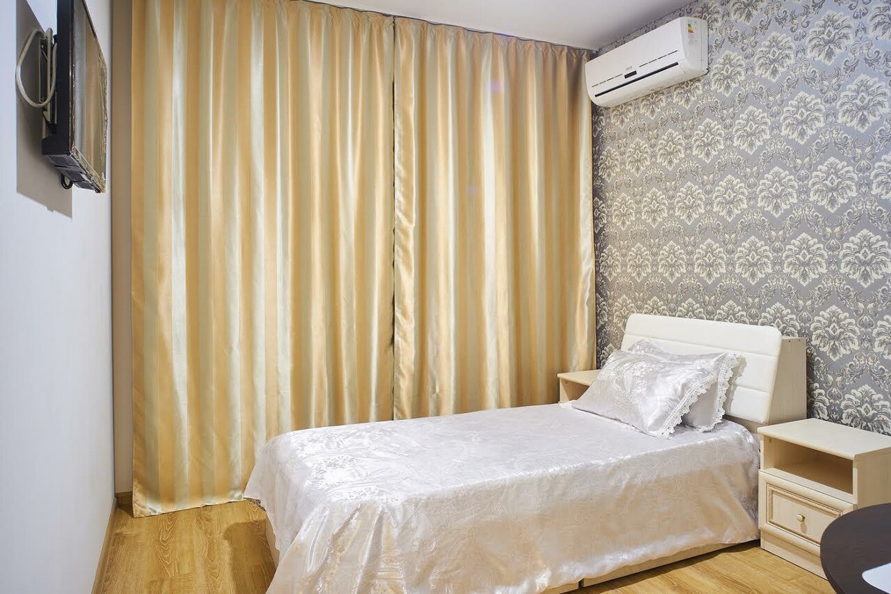 Мне понравились плотные шторы в комнате. Утром свет не слепит в глаза. Матрац хороший, мягкий. Тапочки резиновые стоят в шкафу. Недорогая цена.