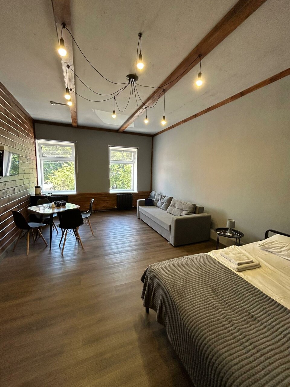 Достоинства: 1. Удаленное заселение, без лишней мороки. 2. Расположение идеальное, кроме того, что окна выходят на довольно шумную улицу. 3. Допускается заселение с животными. 4. Достаточно качественная отделка в стиле лофт и сантехника. 5. На этаже есть СВЧ. 6. В номере тихий холодильник. 7. Площадь 6го номера как целая студия, — 25 квадратов. 8. Городская парковка прямо под окнами, свободные места есть почти всегда. Недостатки: 1. Стоимость всё-таки выше процентов на 20 от соотношения цены и качества. 2. Нет кондиционеров или приточной вентиляции, позволяющей закрыть окна. 3. Окна выходят на шумную улицу, в номерах 1-6 поспать в тишине не получится. 4. Слышимость между номерами очень ощутимая. Ранее на этом этаже были офисы, и, видимо, переделывая помещение под гостиницу, были поставлены не самые толстые каркасные перегородки. От соседей слышен кашель, речь и ТВ.