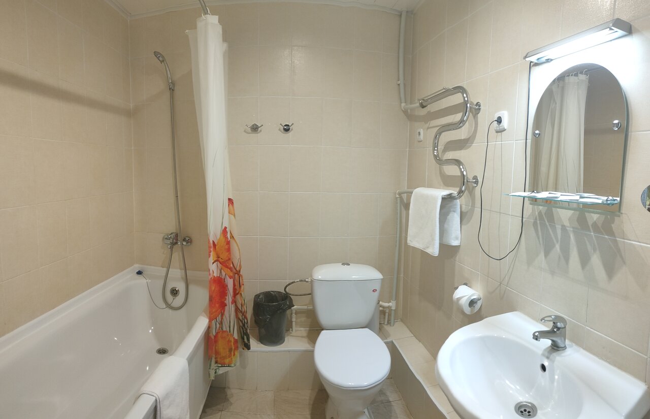 Снимали номер стандарт ,ночевали 1 ночь .Сначала дали номер 404 на 4 этаже , сломан диванчик ,разбита дверь в комнате ,свет тусклый , позвали девушку с ресепшена ,дали номер 506 на 5 этаже .Номер поприличнее конечно,но все равно грязно, вода еле течет , ездили с котиком ,500 рублей взяли отдельно за него доплату .Девушка на ресепшене вежливая ,это +.В принципе переночевать можно, но 1 ночь ,не более.Отель явно заброшен и не хватает рук для качественной уборки .И так же грязные и с мухами плафоны и люстры ,с тусклым освещением .