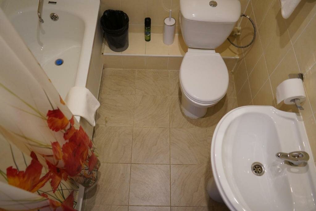 Поселились на одну ночь. Четвертый этаж без лифта. В номере отсутствует кондиционер, даже нет вентилятора, но было два балкона с очень грязными окнами с видом на неухоженную пригостиничную территорию, да и дорожка к отелю не из приятных, как и к ближайшему магниту. Телевизор в номере на кухне, в комнате нет, но и на кухне включается, но не работает, попросили подключить, обещали связаться с айтишником, но, увы, чуда не произошло. Неприятный запах в номере, все окна были закрыты, грязные полы, покоцанная ванна, подвес для душа сломан, душ приходилось держать рукой, крышка для унитаза оторвана, ооочень плохое освещение в номере, под матовым плафоном горит по 1 лампе, прикроватных бра нет. Успокоили себя тем, что переночуем и покинем это отвратительное место. С такси тоже напряжёнка в городе