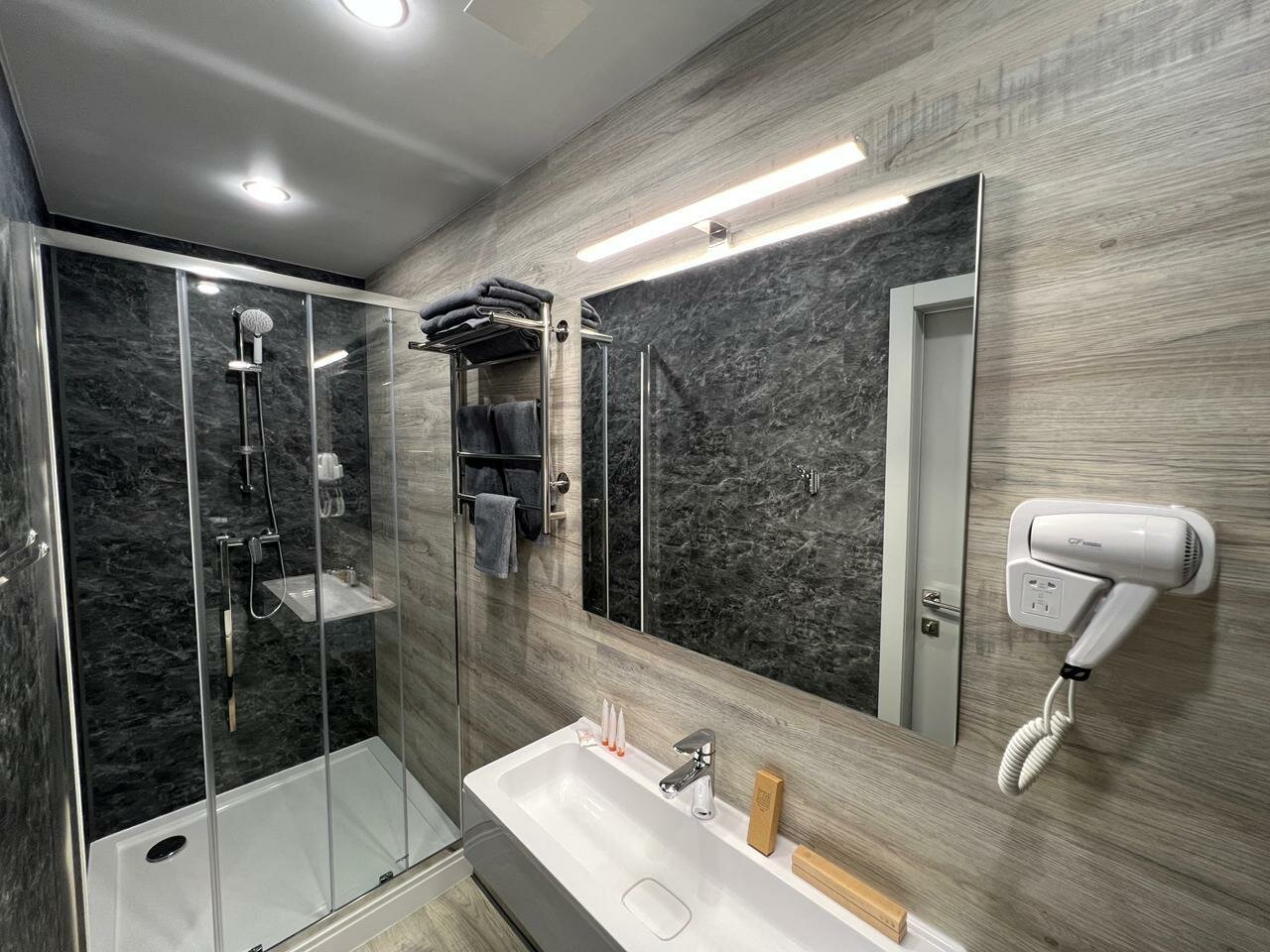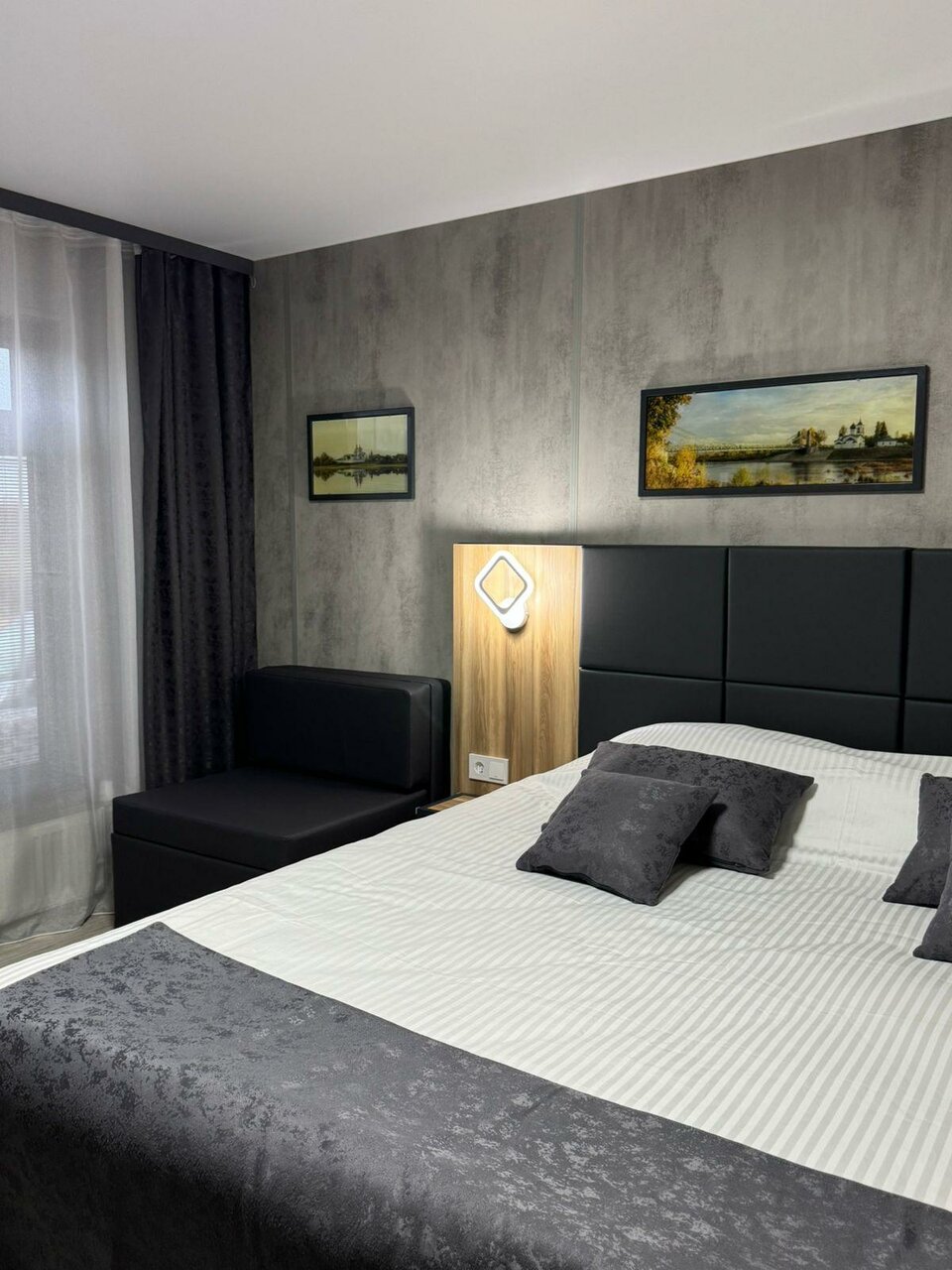 Номер просто супер: стильный дизайн; все новенькое, чистое. Похоже, не экономили на дешевых материалах, прямо, глаз радуется . Цена — восторг для такого уровня. Кафе скоро построят. Будем останавливаться)