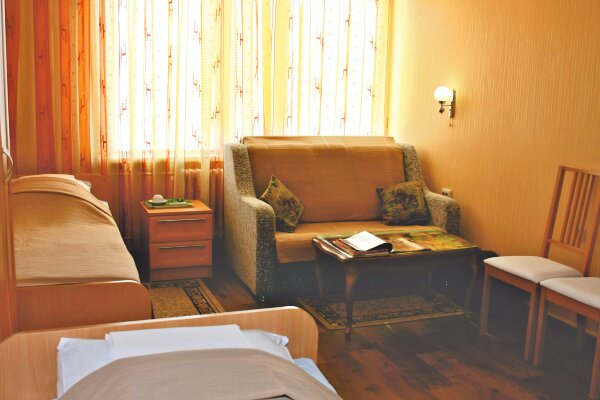 Светлая комната со всеми удобствами для некурящих. Высокие потолки, белоснежное белье. Двуспальная кровать плюс односпальная кровать. Указана цена за сутки для двоих. Чисто, тихо, классно!