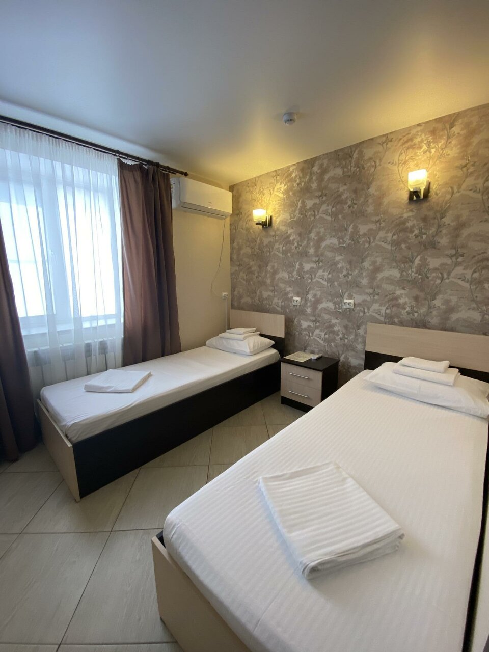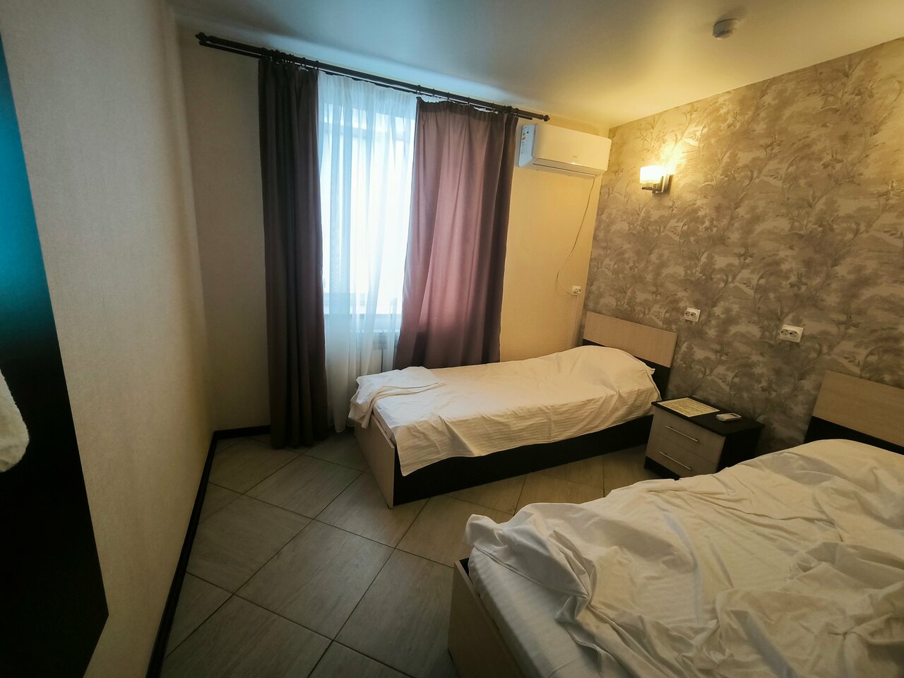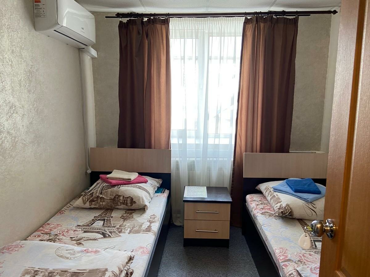'Двухместный номер стандарт площадью 10 кв.м с видом на улицуПодходит для размещения 2 человекИмеет спальню с приятным интерьером.В номере: 2 односпальные кровати.Имеется кондиционер, вешалка.Общая ванная комната.