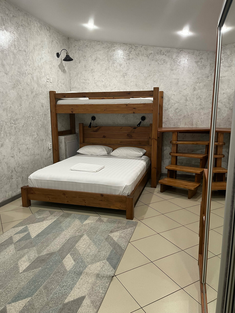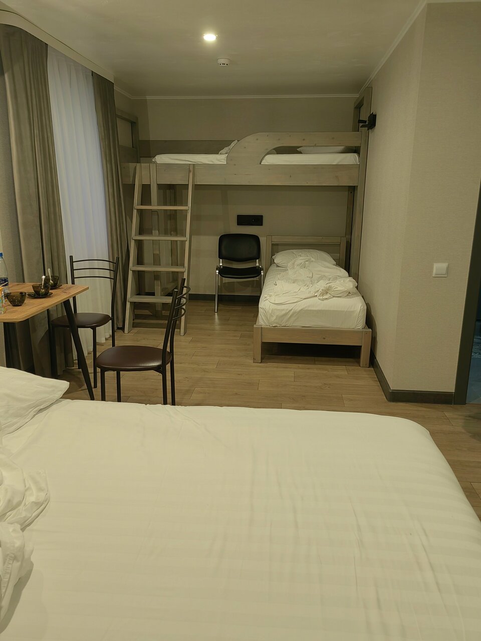 Отличный отель. Семейный номер на 4 человек с шикарным санузлом и добротными деревянными кроватями и белоснежным постельным бельём. Двухъярусная кровать привела в восторг детей. Мне понравились оригинальные светильники-ночники.Свежий ремонт во всей гостинице. Чисто и уютно.