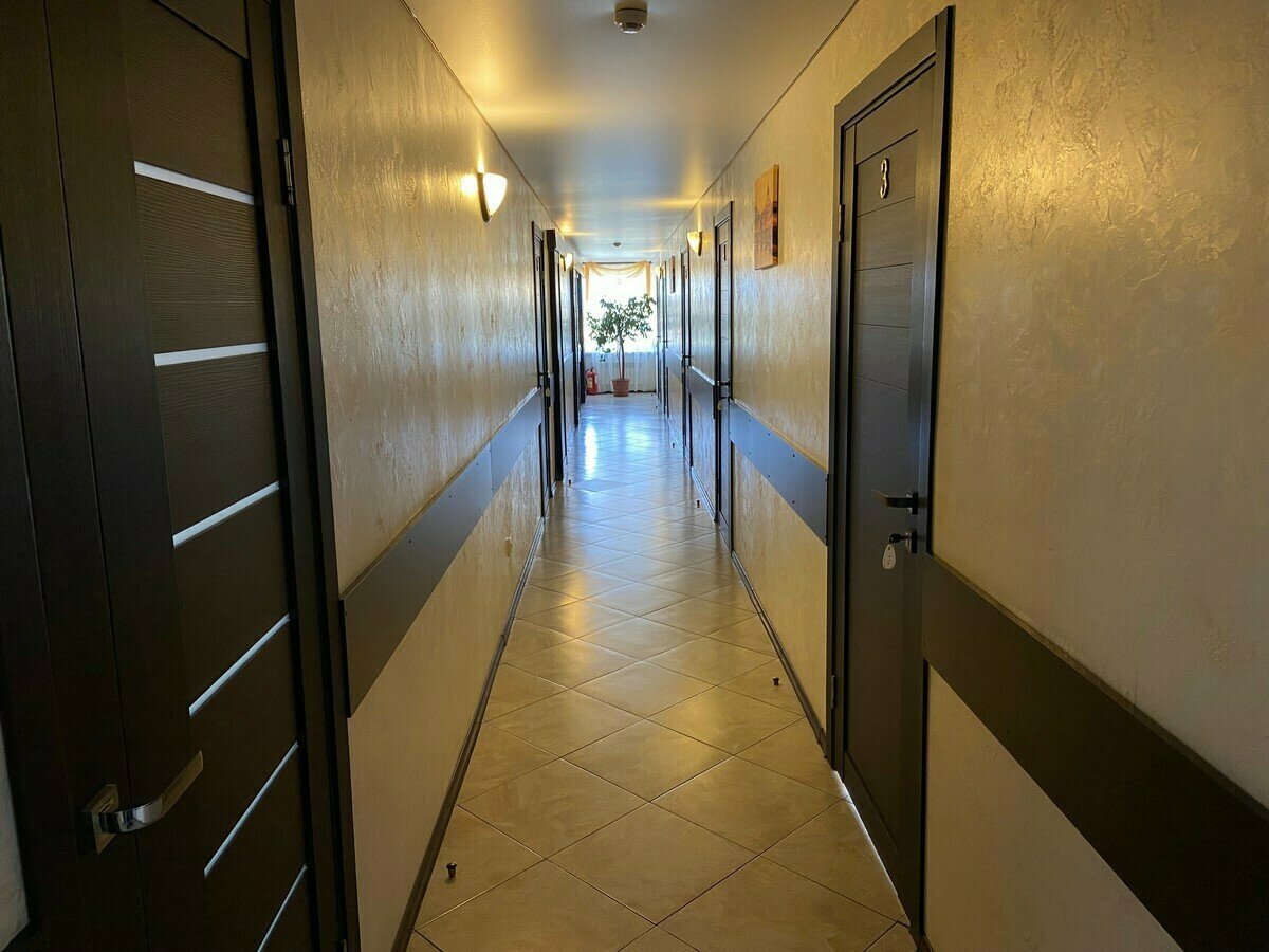 Остановились переночевать по дороге на море. Заселились в два двухместных номера. Комнаты небольшие, но уютные. Хорошо выспались, матрасы и подушки удобные. Санузел к нашим номерам был на этаже, но там очень чисто, есть фен, шампунь и мыло, туалетная бумага. Номера с удобствами тоже есть, но были заняты. Есть кухня, на которой тоже чисто, посуда, чайник, плита, микроволновка, холодильник. Администратор приветливая, все показала, рассказала. Утром заказывали кофе из кофемашины в дорогу.