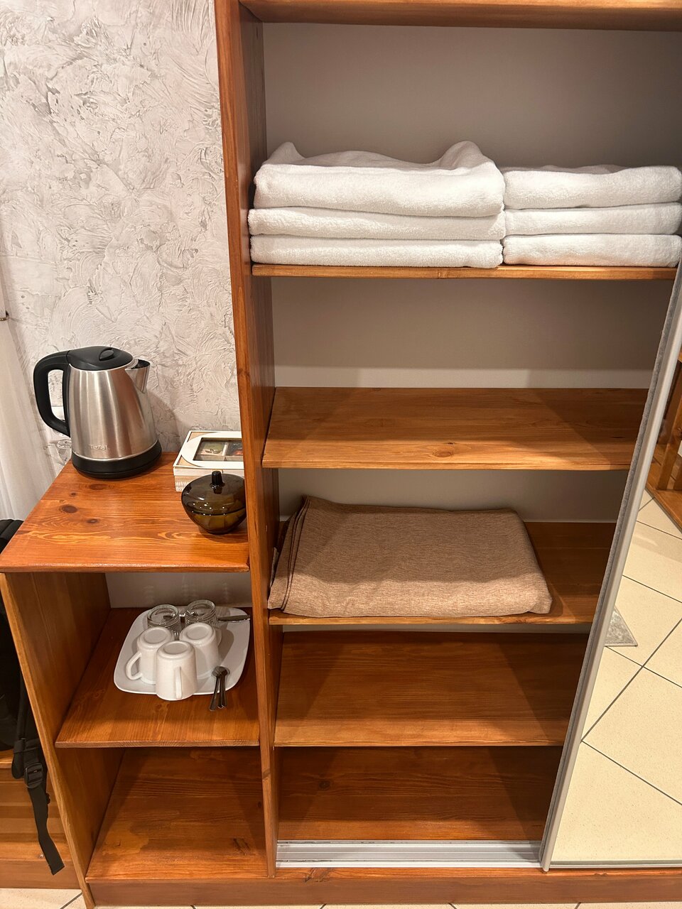 Все очень мило и уютно. Очень отзывчивый персонал. Везде чисто, приятно пахнет моющими средствами. Удобная полностью оборудованная кухня. В душе горячая вода без проблем. Единственным нюансом для нас была большая высокая подушка, отвыкли от таких, спать на ней неудобно.