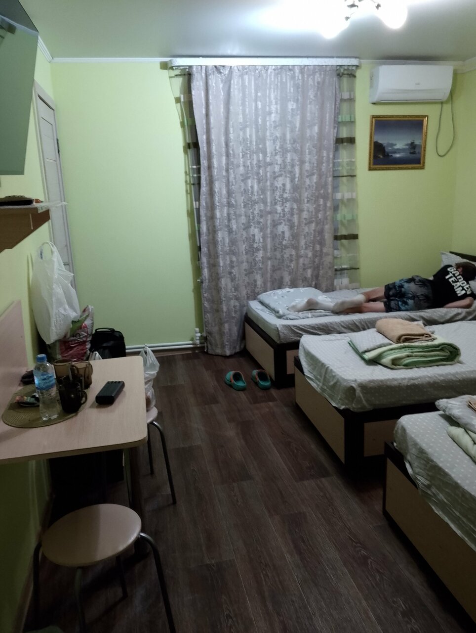 Очень хороший номер на 4х, чистое новое постельное белье, хороший матрац, двуспальная кровать просто гигантская, понравилось, туалет и душ в номере раздельный — удобно. Туалетная бумага, полотенца, все есть. Чай в номере вместе с сахаром, кулер на этаже с горячей и холодной водой. На первом этаже типа кафешки на 2 стола, но больше просто как кухня, цены приятные, борщ вкусный. Гигантский минус в том, что утром горячая вода закончилась. 3е помылись вечером и им хватило. Я пошла утром и фиг мне Выбесило очень, поэтому 4 звезды. Администратор девушка очень вежливая. В общем понравилось всё, кроме воды горячей с утра)