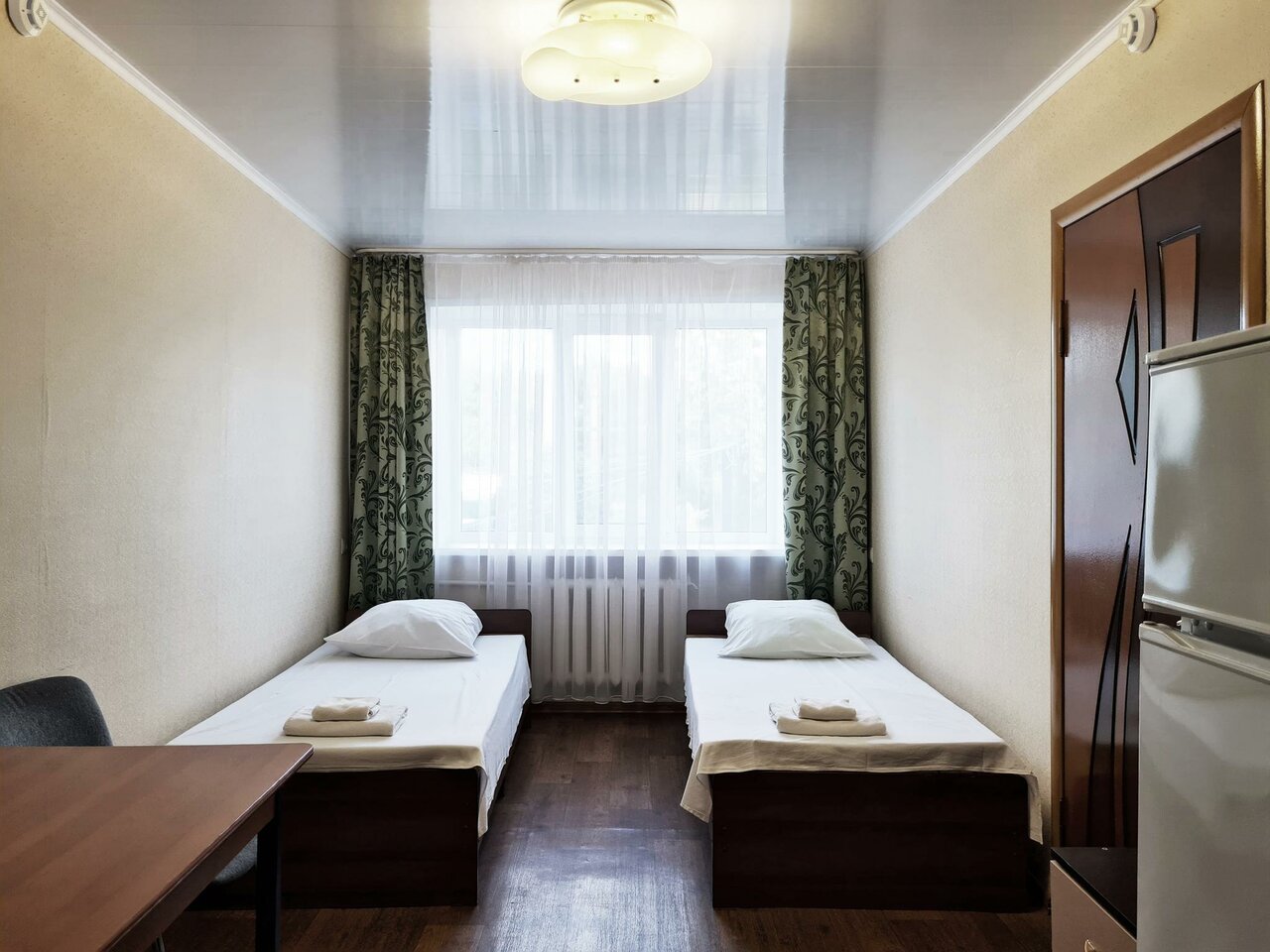 Бюджетная ,но ОЧЕНЬ достойная гостиница. 40номеров,т.е.шансов найти место поздно очень много. ЧИСТО-чистые номера,никакого запаха,на окнах сетки,постельное белье чистое и относительно новое,если нужны одеяла-дают.В нормере кровати,телевизор,стол,2 табуретки,чашки,раковина. Туалет на этаже и мужской и женский,несколько,чистый,без запаха,наличие бумаги. Душ-несколько кабинок,чисто,горячая вода. БЮДЖЕТНО-после 23 нам достались 2 2хместных номера с удобствами на этаже,1500₽за каждый,завтрак входит в стоимость,250р,итого на 4 человека 1000₽,но)))это все в стоимости номера(итого ночлег 2000₽). Также до 23 есть обед и ужин,но мы не успели,но)))недалеко есть круглосуточный фастфуд ‘русский аппетит’-бургеры,хотдоги,сендвичи,тоже недорого-4 бургера около 500₽,вкусные(напоминают завтраки в Маке). В общем рекомендую,особенно,кто транзитом с Крыма,самое оно