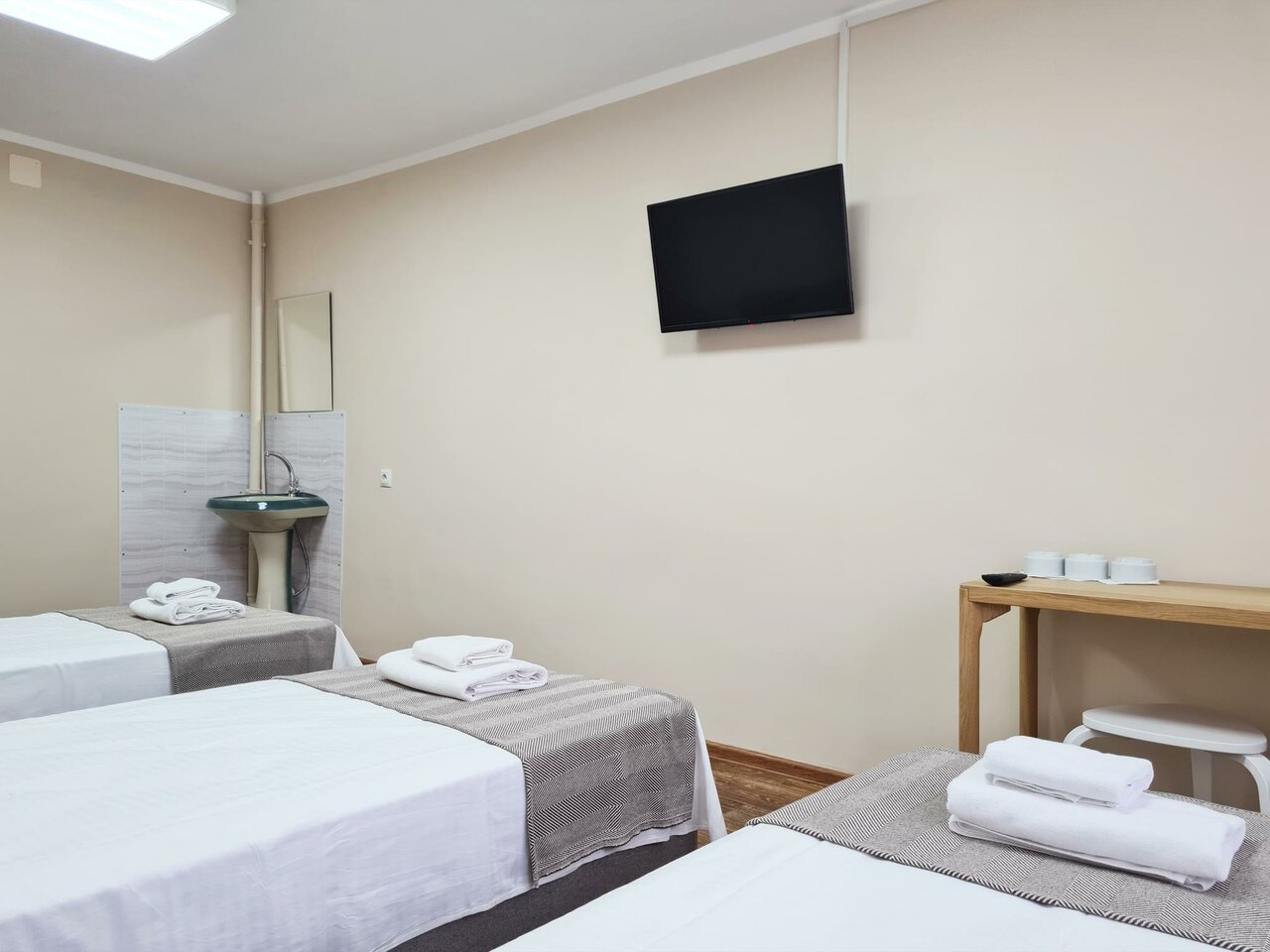 Отличный отель, жили в улучшенном трехместном номере. Есть тапочки, банные принадлежности, полотенца. Отличные кровати, свежий ремонт. Включен завтрак. 5 из 5