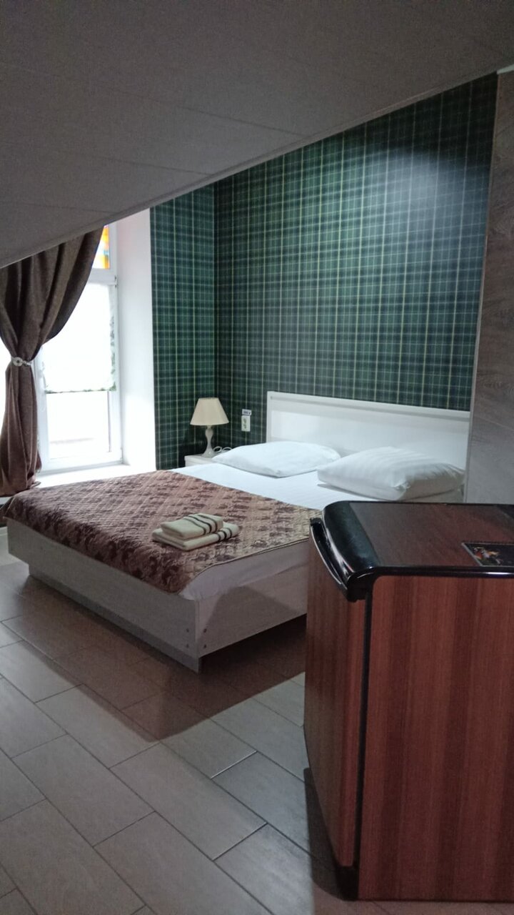 Гостиница в центре города, на третьем этаже здания под крышей. В этом здании на 1 этаже — продуктовый магазин, на 2 этаже — магазин обуви. От магазинов шума не слышно. Снимали номер с 2 отдельными кроватями. Администратор вежливый и внимательный. Хороший, чистый номер, тесноват, но всё есть есть: душ, туалет, кондиционер, шкаф с плечиками и полками, холодильник, чайник, столик, стаканы, настольная лампа, телевизор. Всё исправно работало. Окно было в крыше открывается. Пастель и полотенца хорошие. Трассу не слышно, но рядом площадь, с открытым окном вечером в выходные слышно отдыхающую молодёжь, машины и мотоциклы. Ресторана нет, но можно заказать еду, не пользовался этим. Атмосфера в гостинице спокойная, но если будут шумные соседи — всё слышно, т.к. двери в номерах без порогов, поэтому звук проникает из коридора и других номеров. Парковка рядом неохраняемая, но с видеонаблюдением. В номерах уборку не заметил во время проживания.
