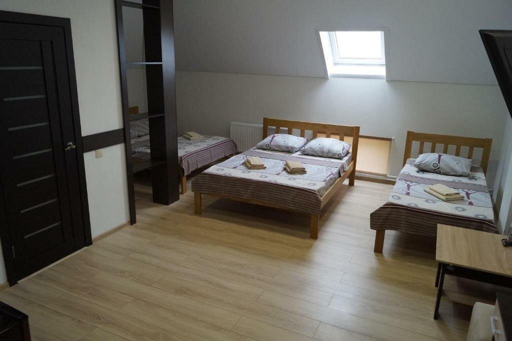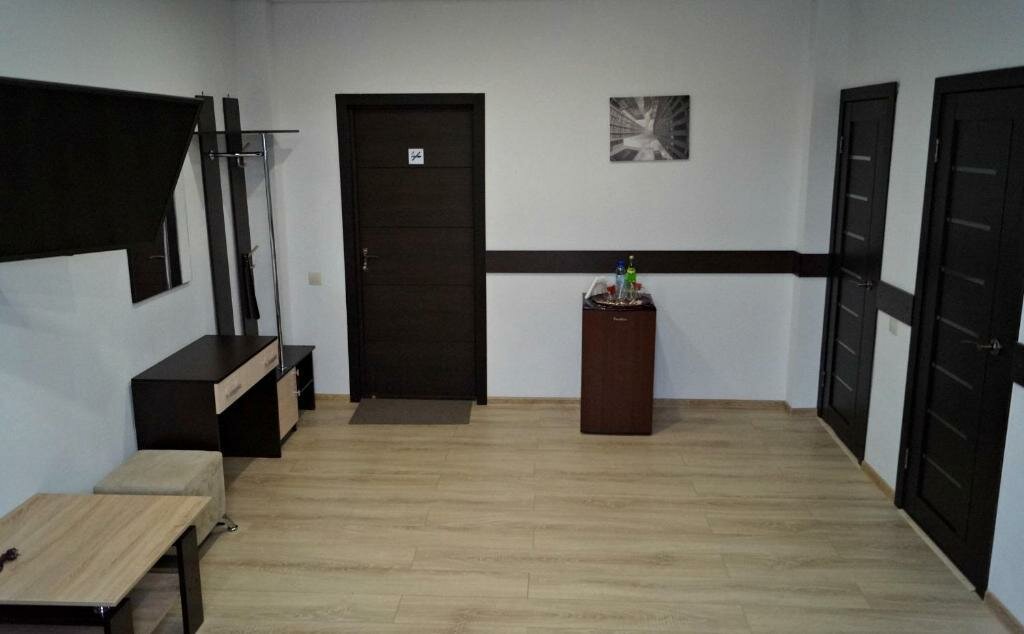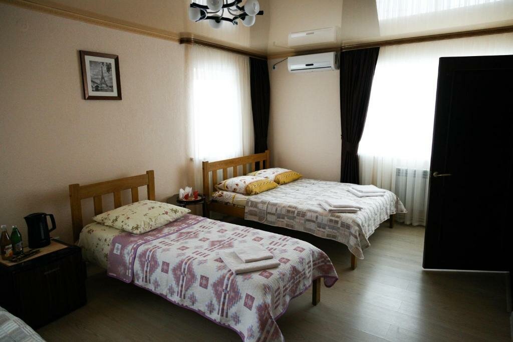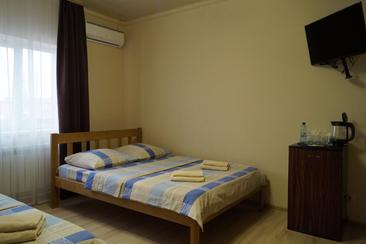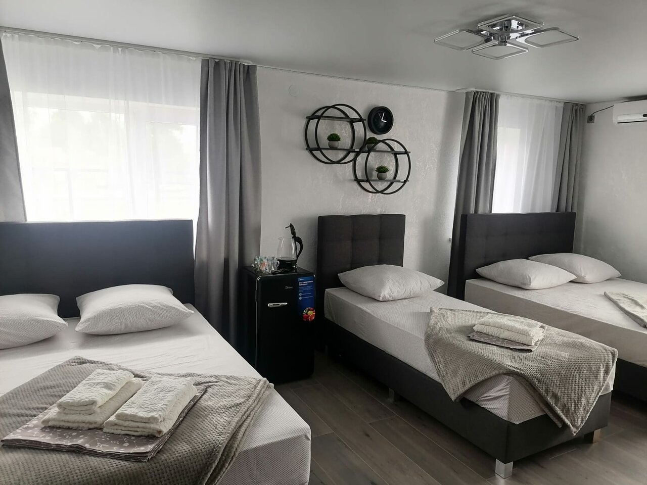 Останавливались втроем по дороге в Крым. Огромный 30 кв метров номер с двумя двуспальными и одной полуторной кроватью, большой телевизор, столик, комод. Все новое, мебель современная, белье и полотенца новые, очень приличного качества. В номере чайник, посуда, лимонад, вода, чай, сахар, одноразовые зубные щетки, мыло, гель для душа. Все для комфортного отдыха после долгой дороги. Спасибо огромное!!! Цена номера 3000 руб полностью соответствует его качеству. Часто путешествуем, и есть с чем сравнивать