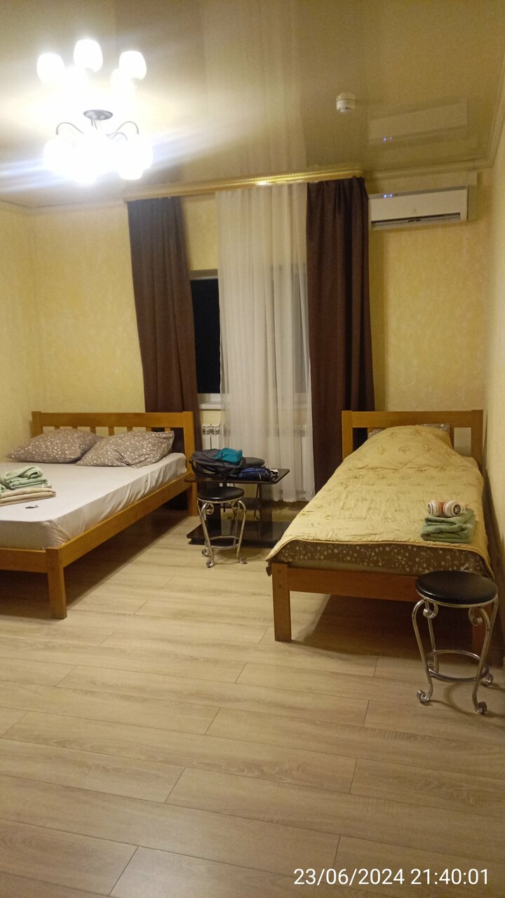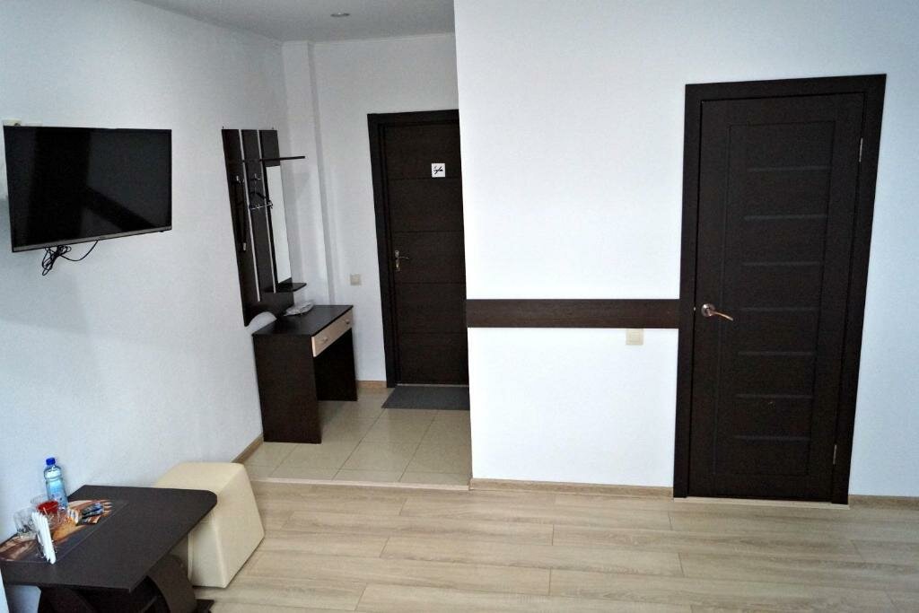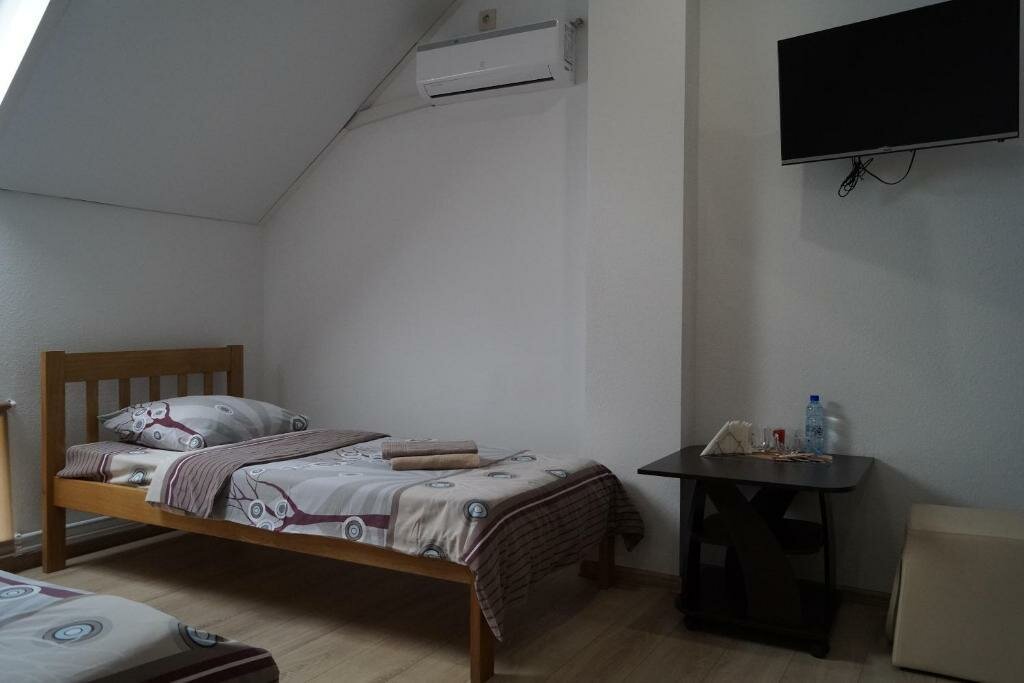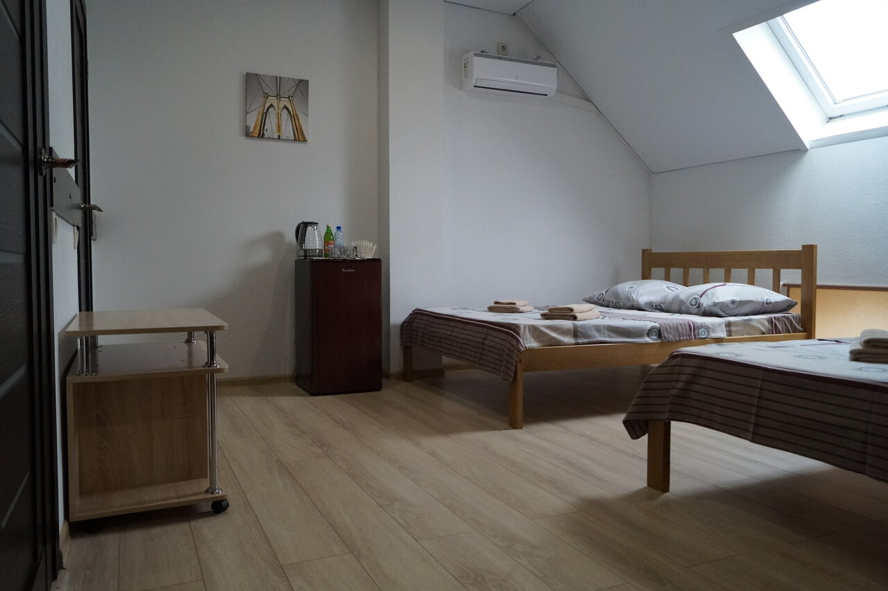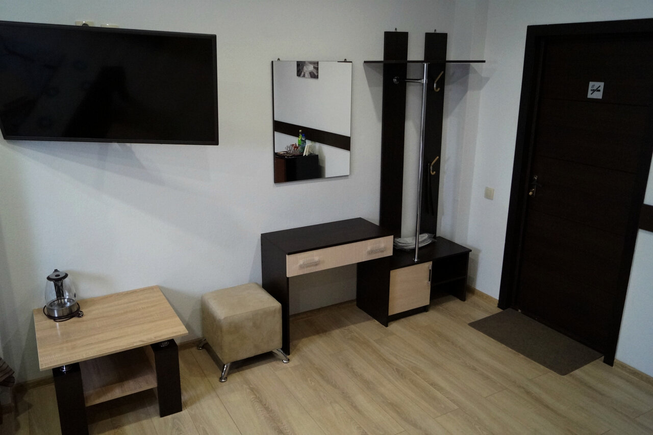 Останавливались втроем по дороге в Крым. Огромный 30 кв метров номер с двумя двуспальными и одной полуторной кроватью, большой телевизор, столик, комод. Все новое, мебель современная, белье и полотенца новые, очень приличного качества. В номере чайник, посуда, лимонад, вода, чай, сахар, одноразовые зубные щетки, мыло, гель для душа. Все для комфортного отдыха после долгой дороги. Спасибо огромное!!! Цена номера 3000 руб полностью соответствует его качеству. Часто путешествуем, и есть с чем сравнивать