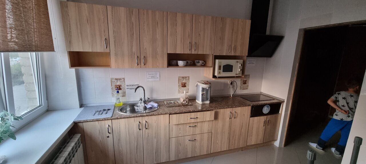 Очень хороший отель. Остановились переночевать с маленьким ребёнком. Стоимость номеров в соотношении цена — качество отличное. Ремонт в отеле свежий. Персонал отзывчивый. У нас в номере была настолько большая кровать, что не стали даже брать отдельно детскую. Кухня на этаже со всеми принадлежности, даже если чего-то нет, думаю можно попросить у персонала, предоставят.
