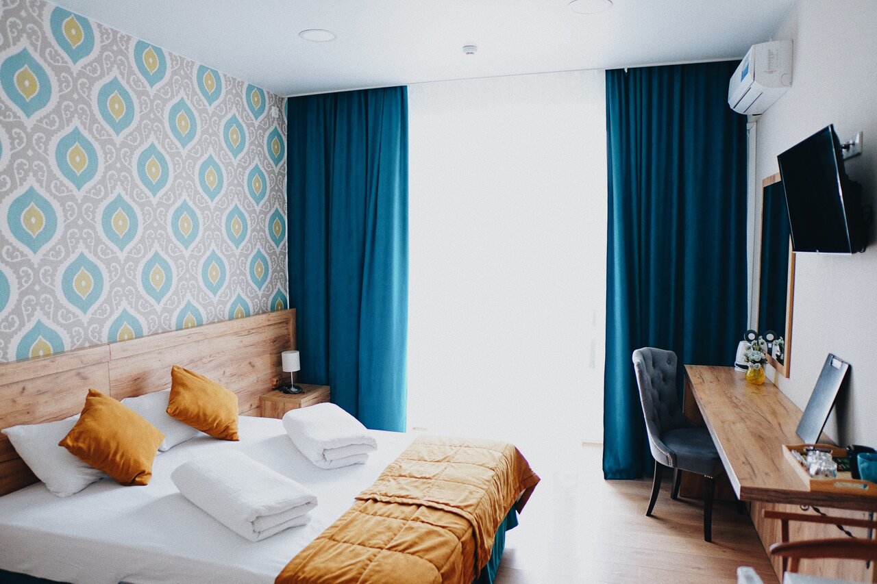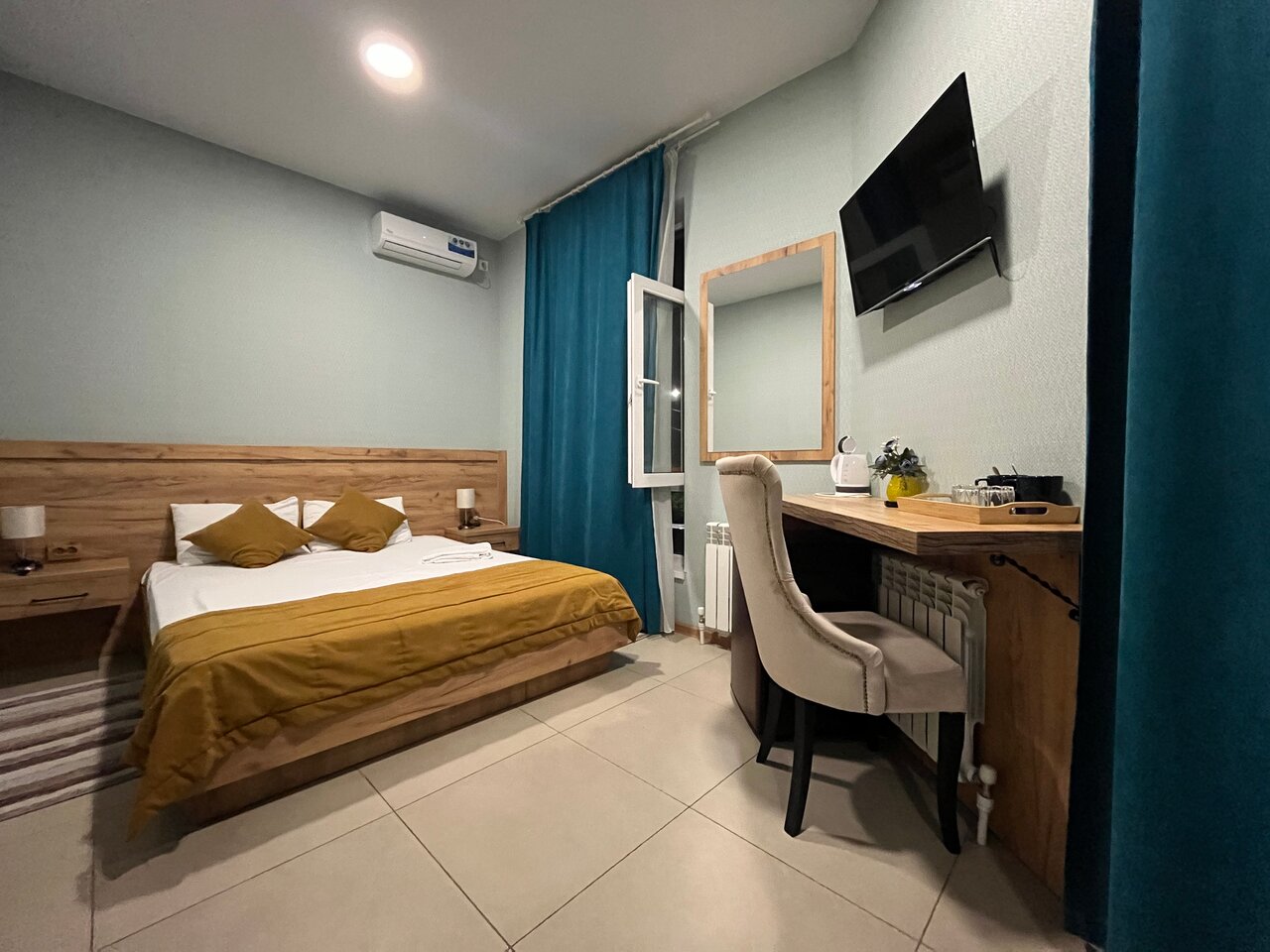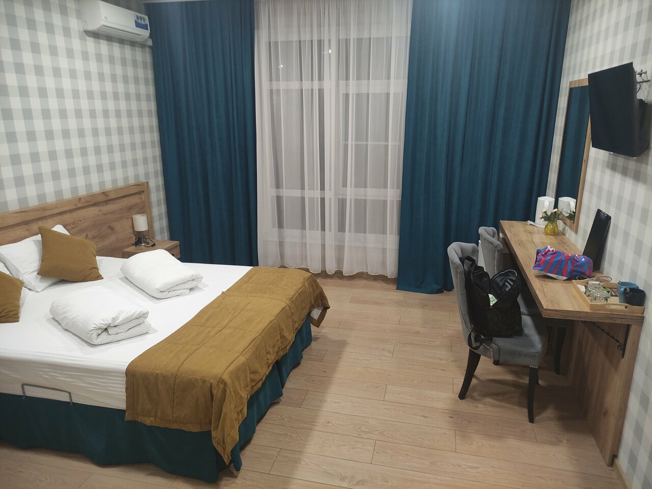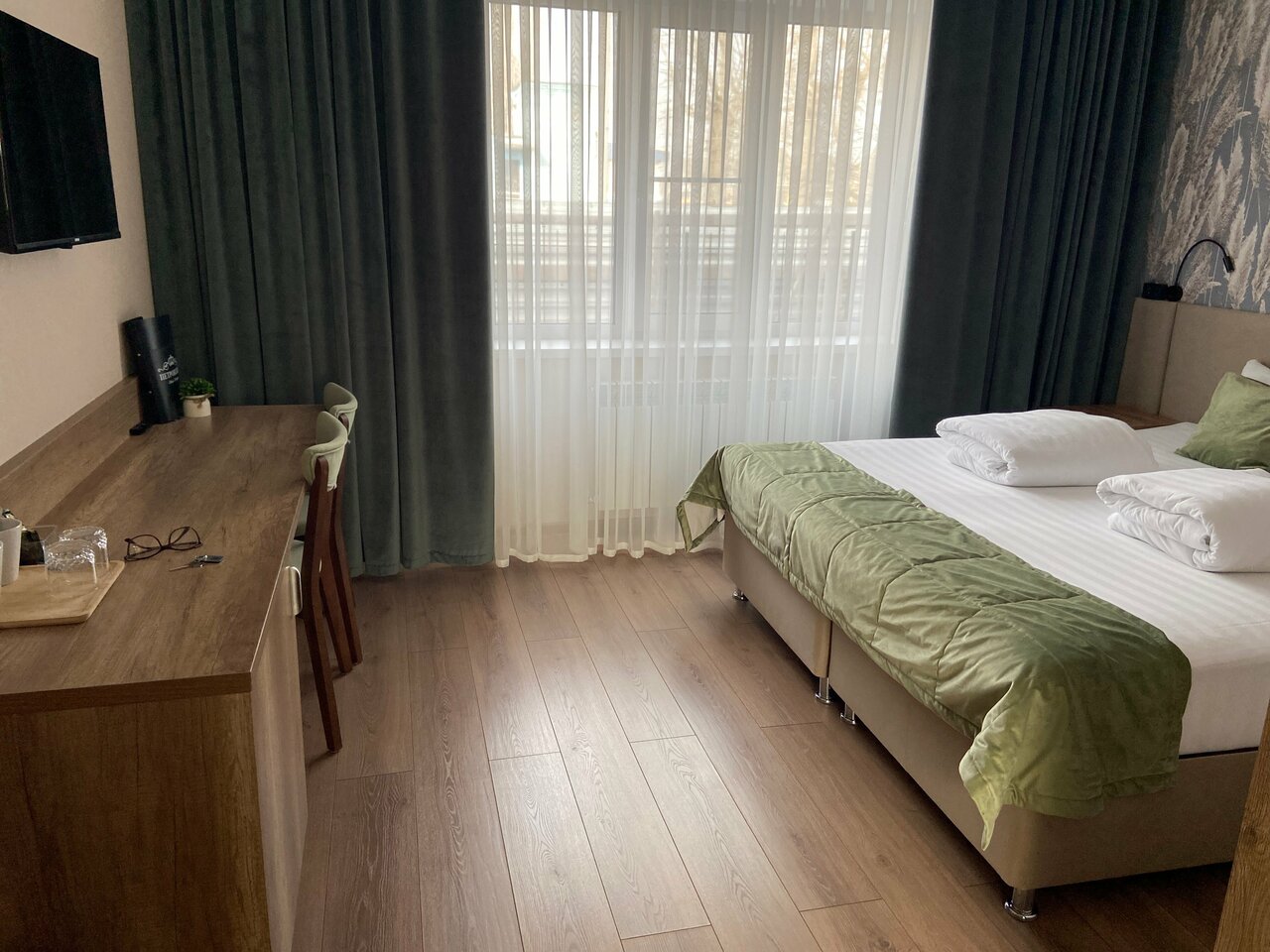 Останавливались в этой гостинице на одну ночь по дороге на море. Данный отель оставил хорошее впечатление у нас. Удобный заезд, наличие парковки, номер просторный и современный. В номере есть все необходимое вплоть до зубных щеток и тапочек. На этаже кулер с водой. Можно заказать завтрак при бронировании за дополнительную плату, который принесут в номер в обозначенное вами время. Но завтрак не впечатлил, очень скудный (два вареных яйца, бутерброд и блинчики с джемом). При отеле есть ресторан, но мы не ходили, поэтому оценить не могу. Рядом в шаговой доступности сетевые магазины, парк. Однозначно рекомендую данный отель.