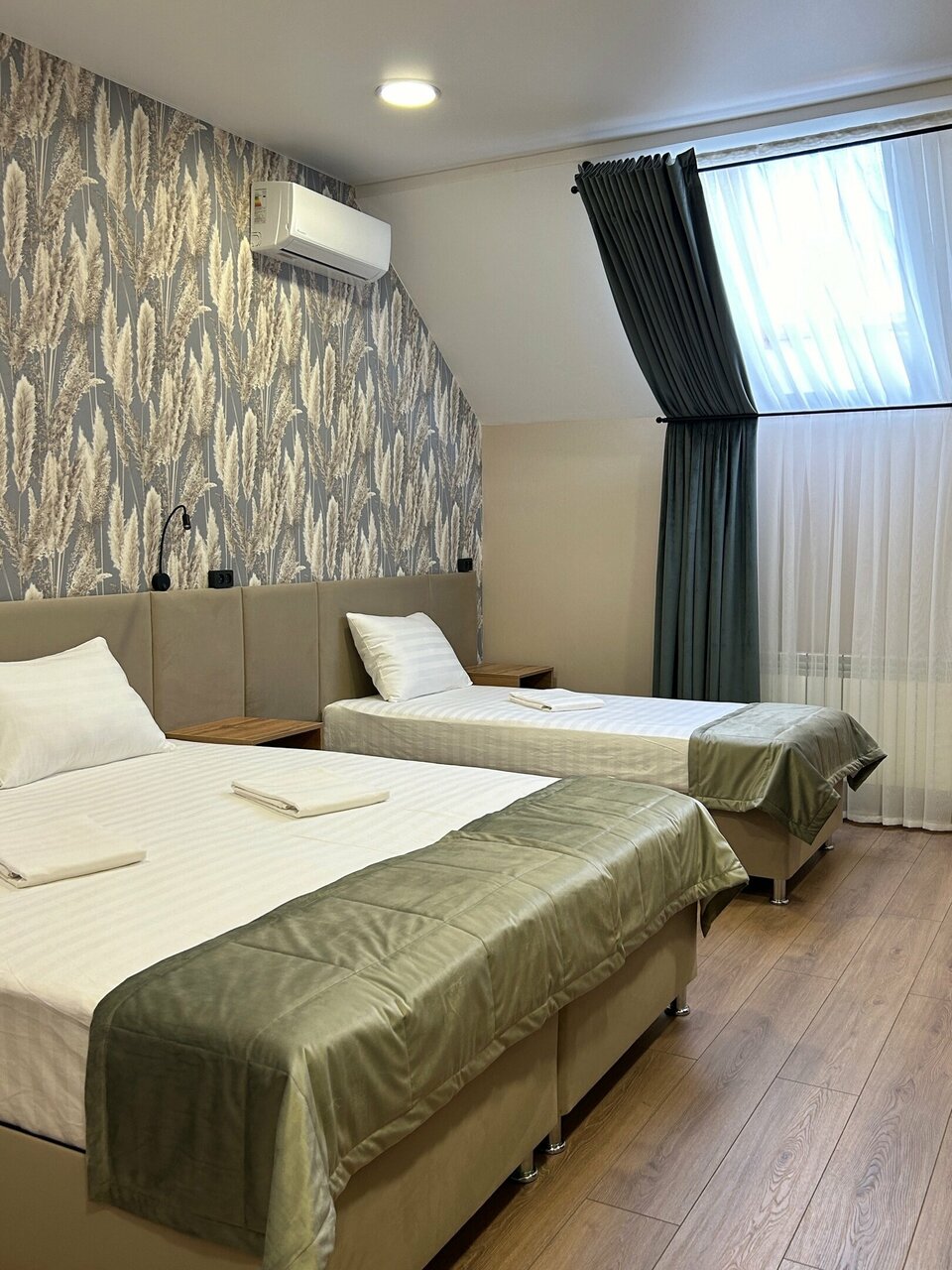 Комфортабельный двухместный номер с двумя односпальными кроватями. В номере есть телевизор, кондиционер, собственная ванная комната, холодильник, рабочая зона и все для Вашего отдыха.Бронирование по телефону: +7 (960) 126-47-47