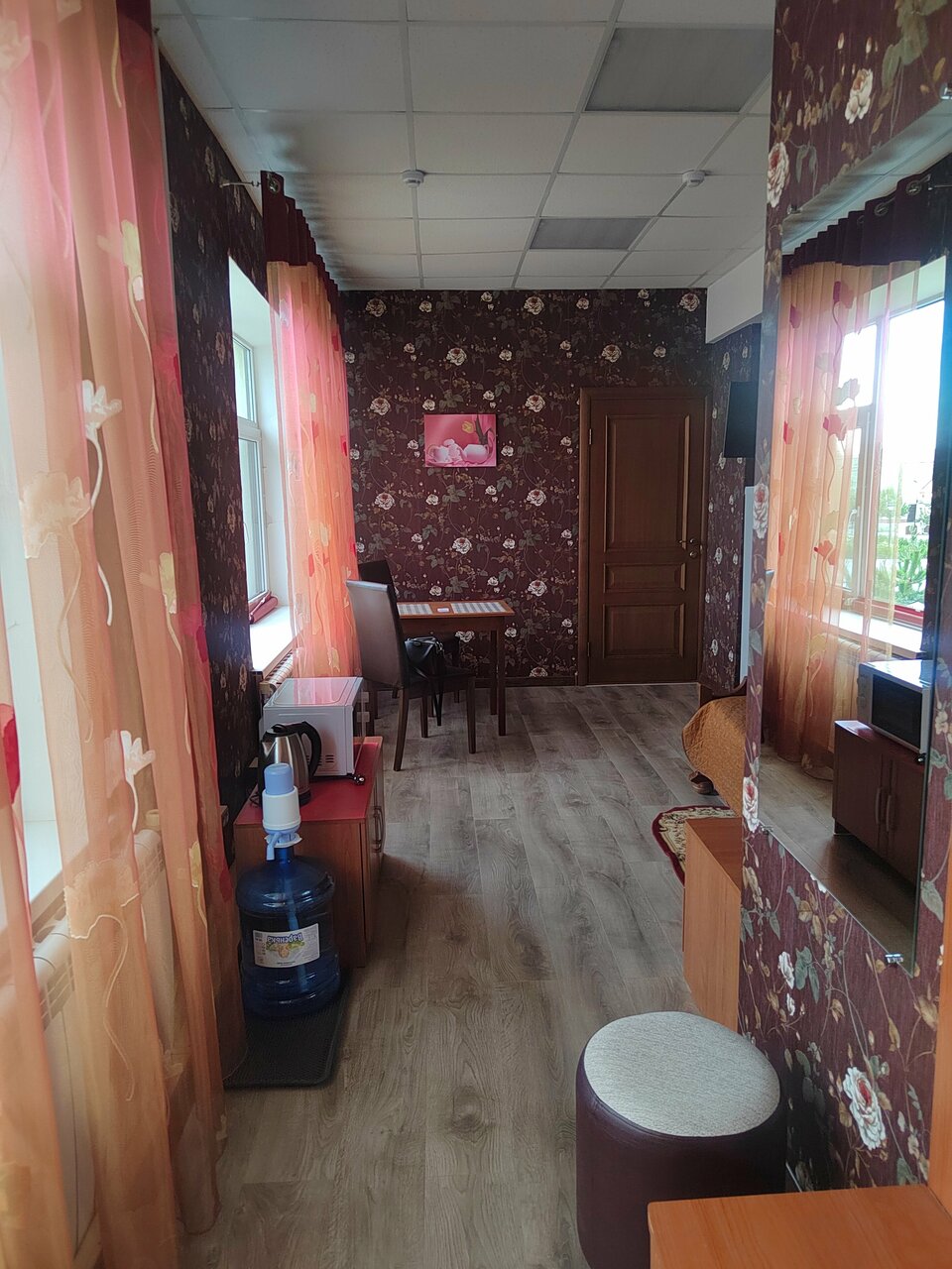 Неплохая гостиница, но удобств в номере минимум , стол ,стулья ,шкаф и телевизор, туалет общий , есть мужской и женский, холодильник у администратора как и чайник с водой, а так чистые номера , вежливый персонал.