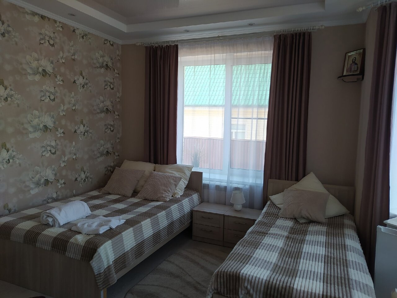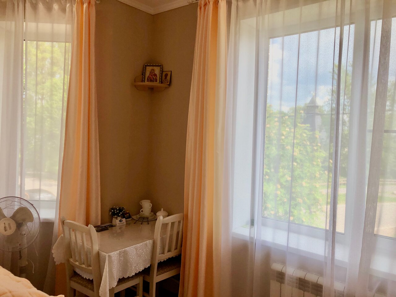 Отличный мини-отель. Вид из окна на фото — прямо из окна отрывается вид на монастырь. В некоторых номерах нет душа — есть две душевые комнаты на этаже. И в некоторых номерах нет холодильников — они есть на первом этаже на кухне. Есть кухня — холодильник, чайник, плита и всё, что может понадобиться. Атмосфера дружелюбная, по договоренности можно поставить автомобиль на территории мини-отеля. До главного входа на территорию монастыря четыре минуты прогулочным шагом.