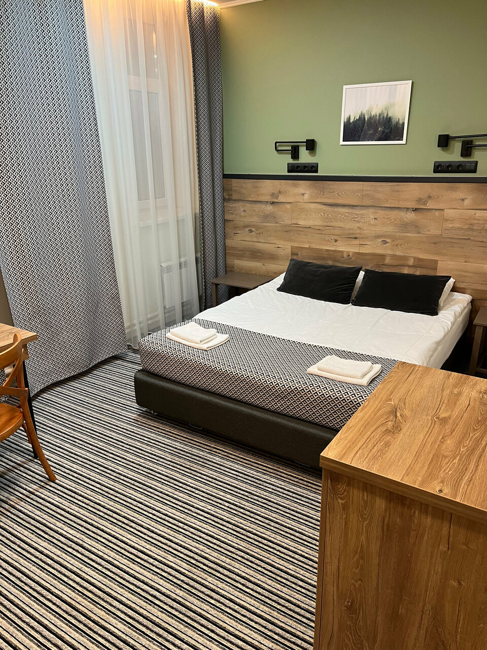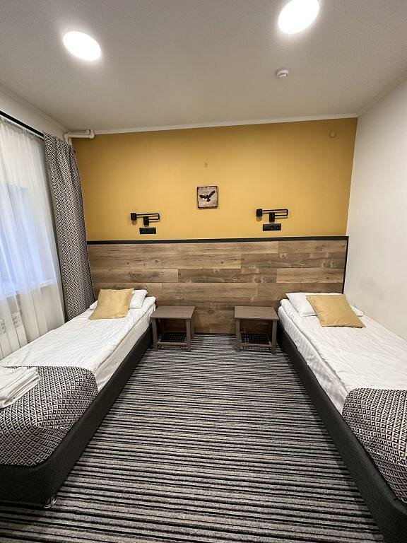 Жили одну ночь в 4-местном люксе номер 11 на 2-м этаже. Отличный новый отель, просторный номер, чистая удобная мебель! Удачное расположение рядом с основными дорогами, при этом в котловине, окруженной лесом. Тишина!!! В номере кофемашина! Немного портит впечатление не очень разнообразный выбор завтраков: было бы неплохо добавить йогуртов и творожков в заводской упаковке, фруктов.