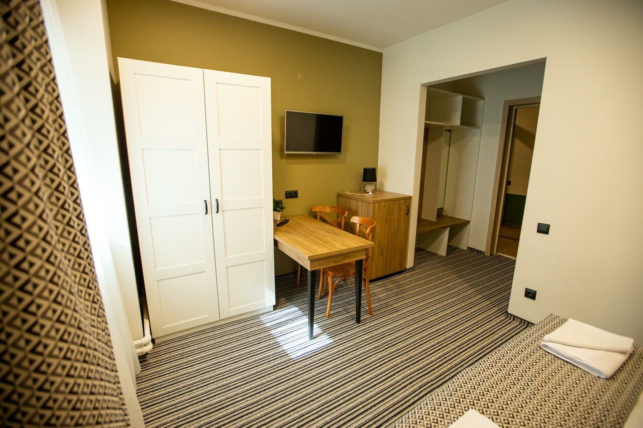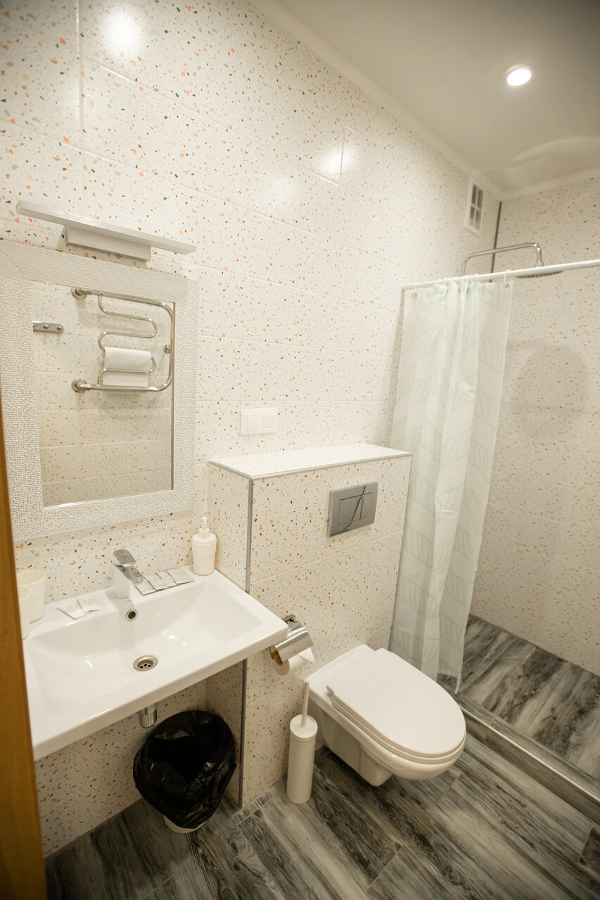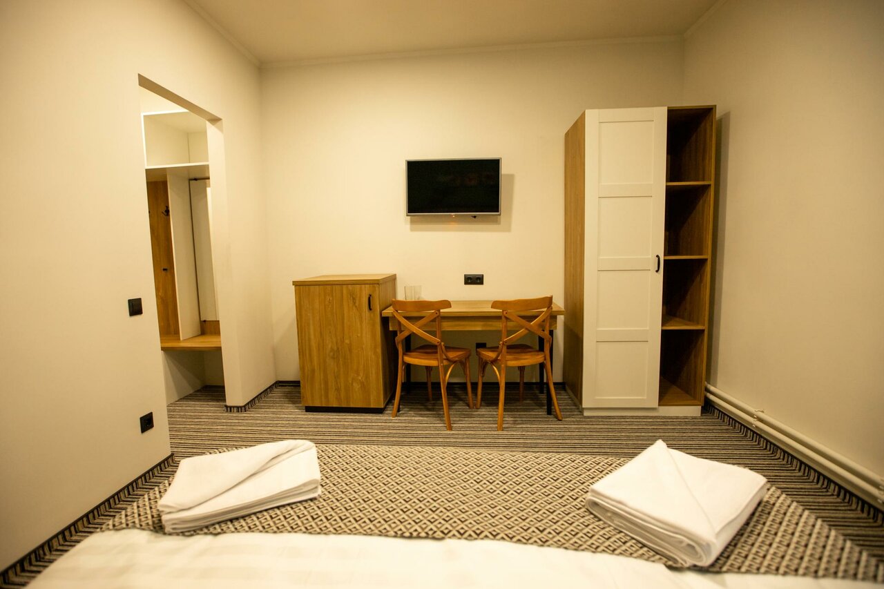 Хороший отель, в 5 минутах езды от монастыря. Завтрак 3-х видов. Заказываете с вечера. Кофе или чай 1 чашка на человека. Номера современные. Есть мыльные принадлежности. Очень странно расположены розетки над кроватью. Сняла оценку за равнодушие к состоянию парковки и подходу к отелю. Могли бы в такой гололёд посыпать хотя бы немного песко или гравием .