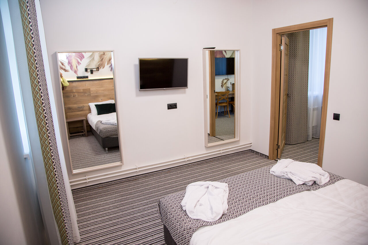Оснащение: две уютные комнаты с диваном, шкафом для одежды, зеркалом, туалетным столиком, комодом, кроватью, телефоном, wi-fi интернетом, телевизором с цифровым тв, ванной комнатой. Стоимость номера — 3 300 руб. В стоимость номера для пр