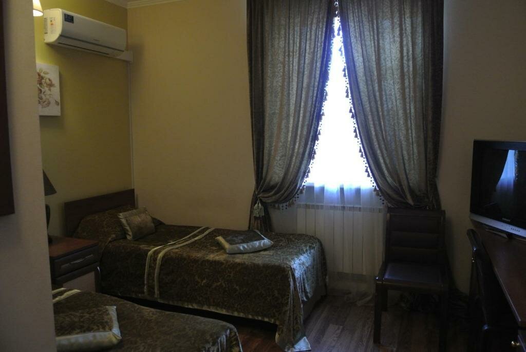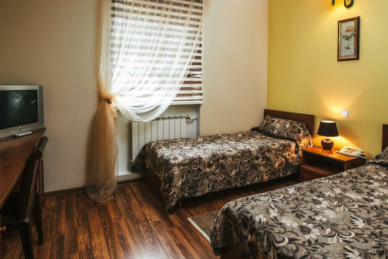 В номере: телевизор, телефон, душ, туалет, 2 раздельные кровати, обои и ковролин, фен, Wi -Fi, на окнах - шторы. Окна номеров выходят как на центральный проспект города, так и на тихую дворовую территорию. Площадь номера составляет 15 м2.