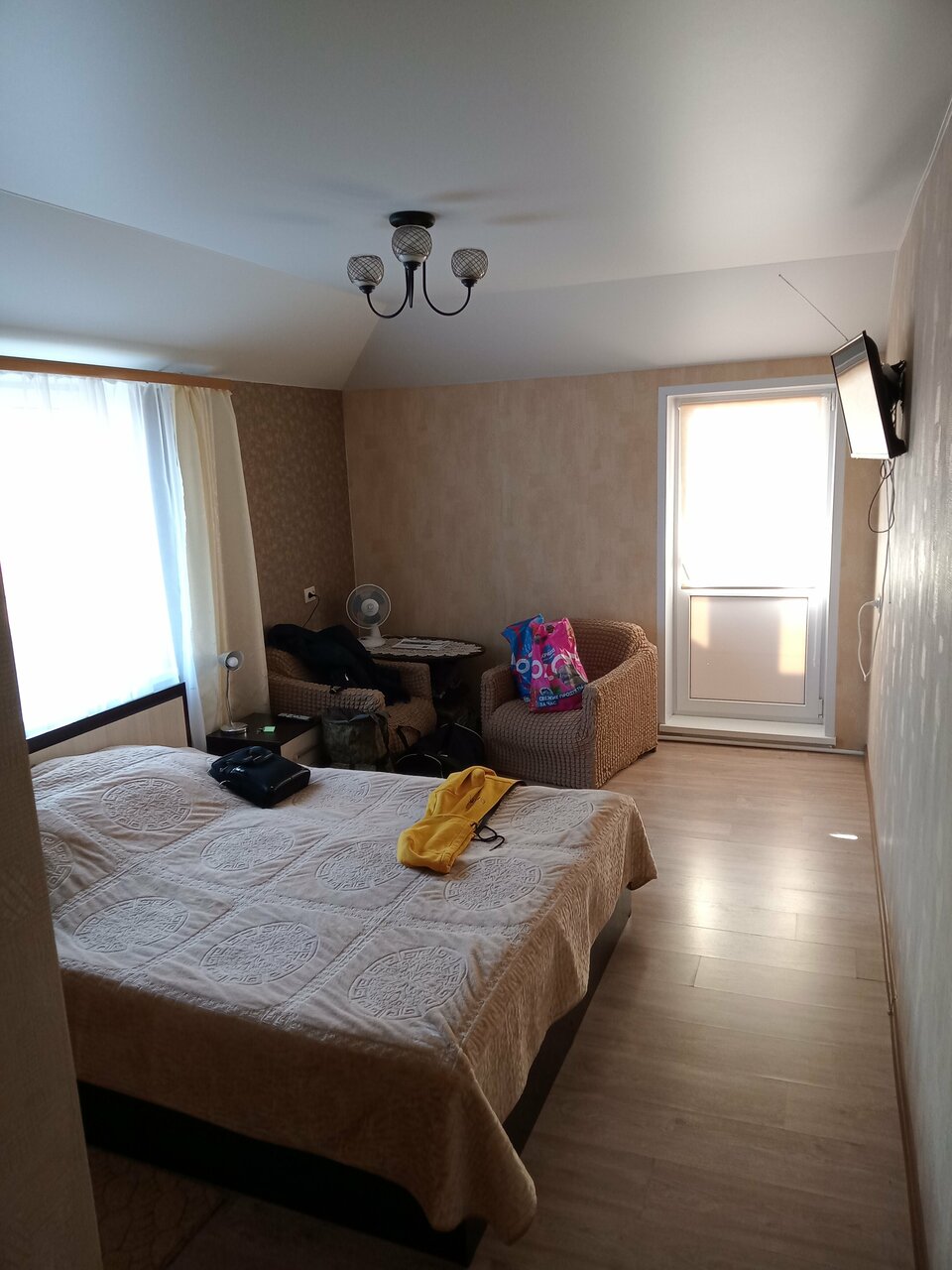 Озвучу минусы. Постельное не хлопок. Мало кастрюль и сковородок. Есть номер где течёт душевая кабина. В номере 4 нет ни комода ни шкафа, ни кресел, а стоимость как у номера 3,где есть шкаф и кресла. Уборка на тройку. Стоит подумать о клининге, они будут убираться хорошо. Пол на балконе не убирается.