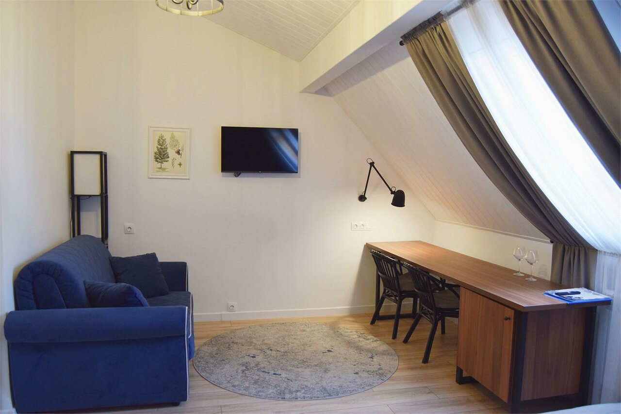 «Люкс Прованс» — просторный номер для душевного отдыха. Два кресла с журнальным столиком располагают к чаепитию и долгой беседе. Благодаря собственному камину, в номере всегда уютно и тепло. Вы можете провести время за книгой или посмотреть любимо...