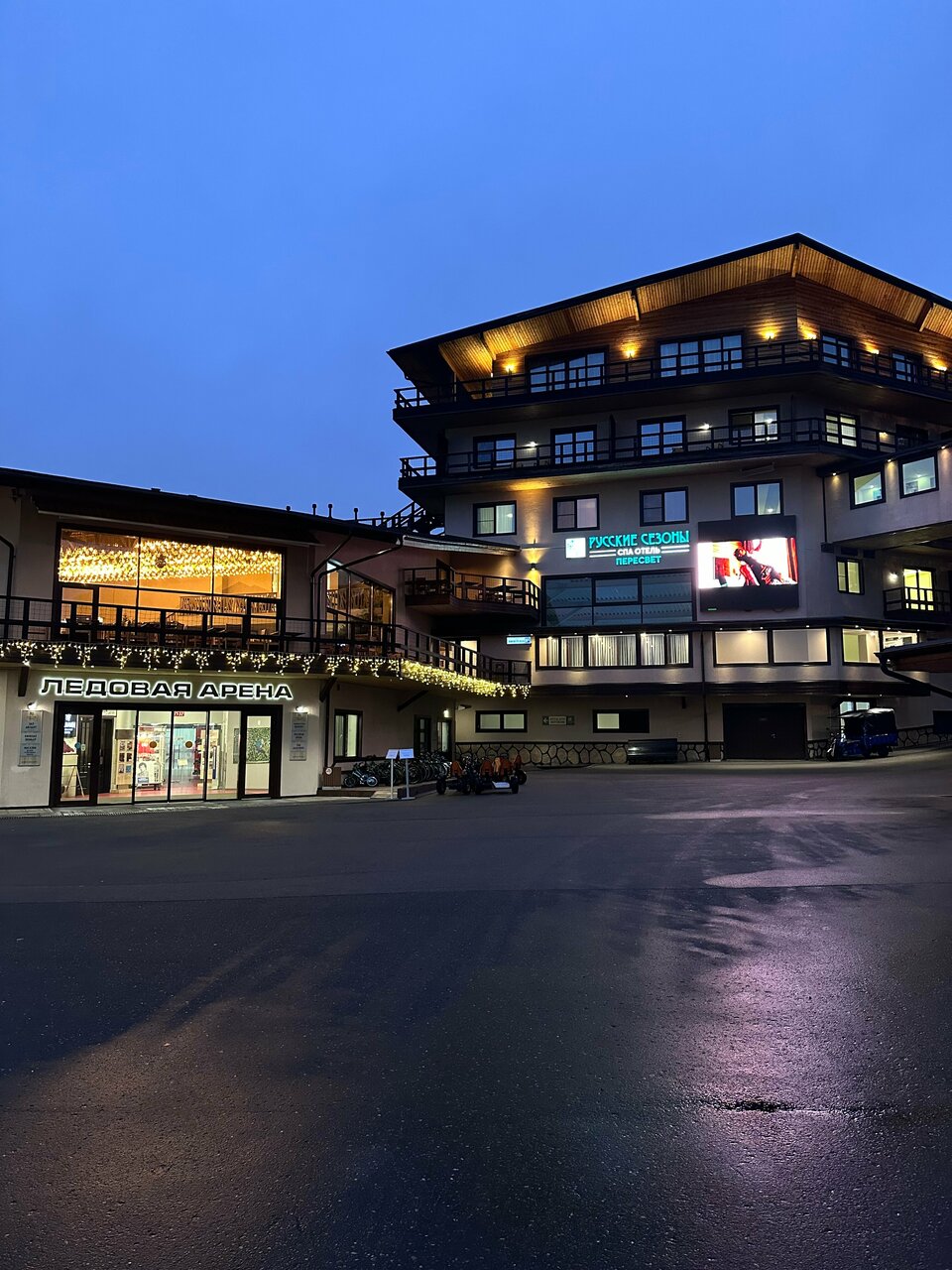 Четыре дня были с командой в августе 22 на тренировочных сборах по хоккею. Ледовая арена хорошая, замечания только к раздевалкам — плохо высыхают коньки и щитки, нужна сушилка. Стирка формы есть. Еда — шведский стол, ассортимент достаточно разнообразный. Номер просторный, кондиционер. Территория комплекса большая, есть где погулять и поразвлекаться. Все понравилось.