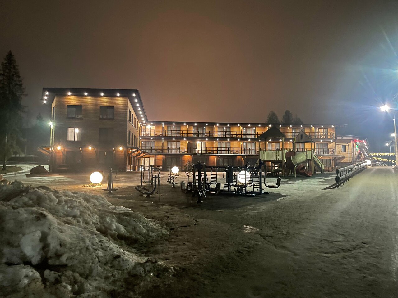Большая территория, жилье на разный выбор (гостиница, домики), хорошая кухня, небольшой зоопарк, эко-тропа, бассейн, баня, стадион, каток и много другого.
