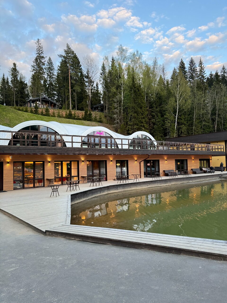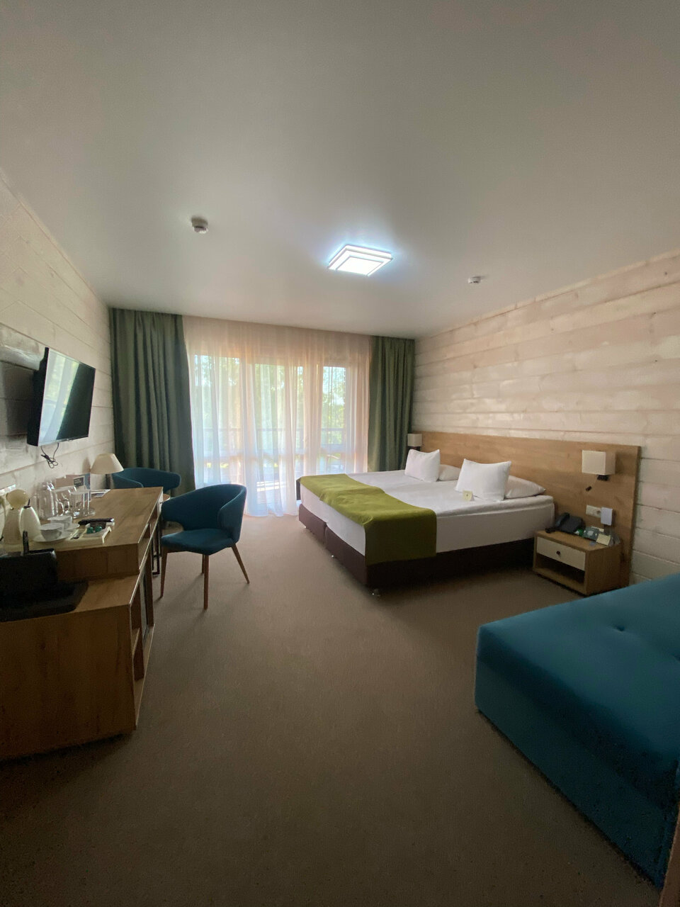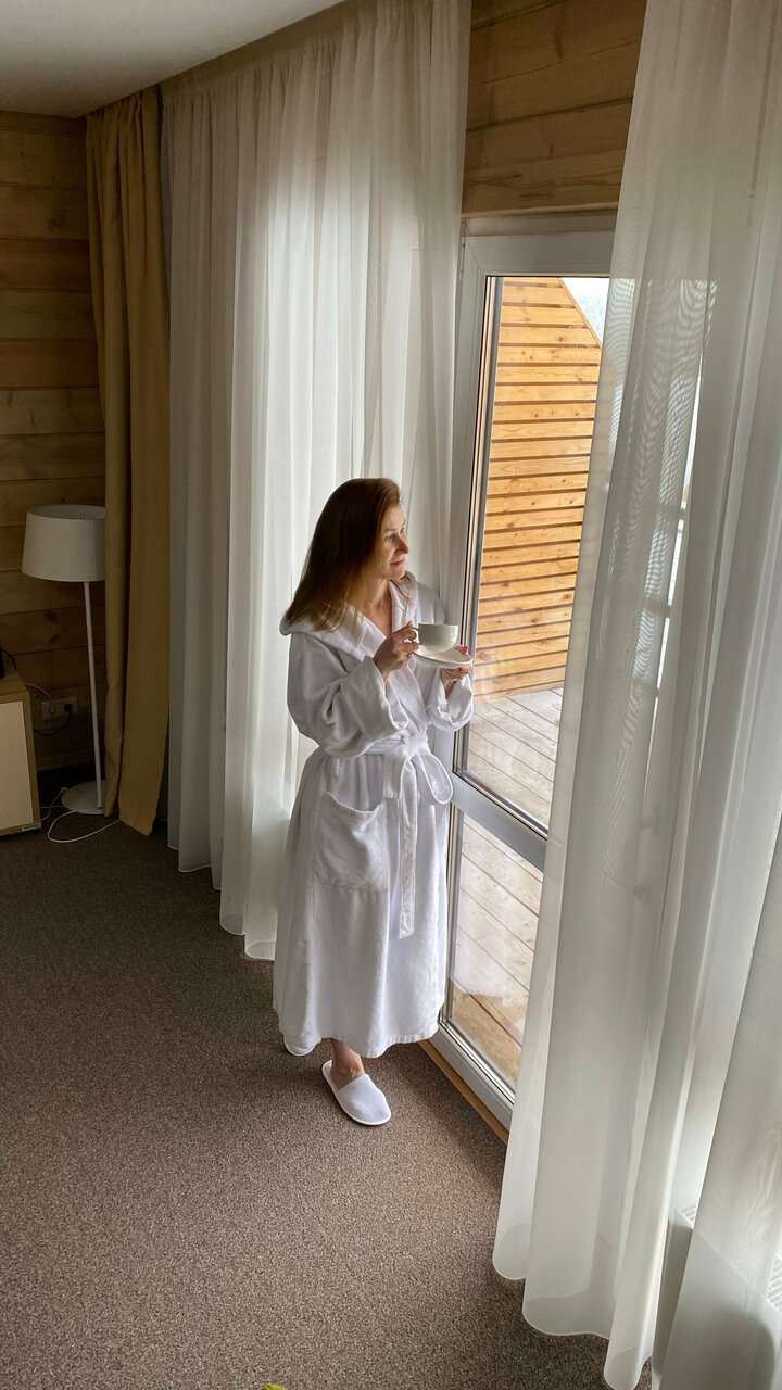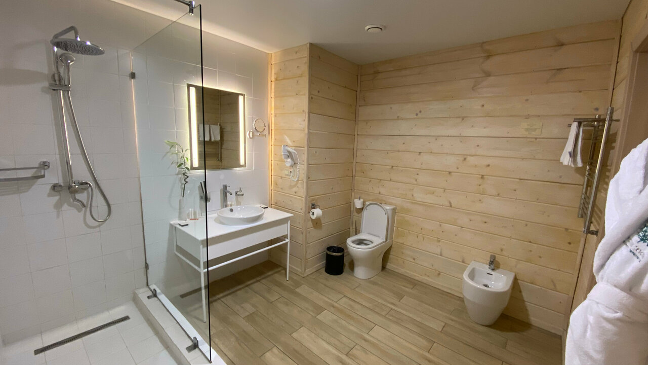 Все очень понравилось. Начиная с номера и заканчивая территорией. Номер приятный, все в дереве, в нем отлично дышится и пахнет.Все средства гигиены есть, халаты, полотенца мягкие и пушистые.Прекрасный шведский стол. Нет огромного разнообразия, но все,что бы вкусно покушать присутствует. Несколько видов мяса, рыбка. Соления, салатики, овощи ,фрукты. Нет лишних невкусных салатов, которые создают массовку, но совсем не съедобные. Завтраки отличные.Вообщем с едой все на 5!Бассейн с выходом на улицу это вишенка на торте))) Так приятно сидеть в горячей водичке, на свежем воздухе. Очень прикольно. Если хочется полноценно поплавать, есть большой бассейн 4-5 дорожек.В каждом бассейне есть сауна. Огромнейшая территория. Мы гуляли поздно вечером. Это сказка. Все освещено, дорожки в лесу широкие, расчищены, везде фонари светят как днем))) мы гуляли в 24 часа и было очень комфортно. Воздух, лес,атмосфера сказочная. Вообщем все прекрасно.