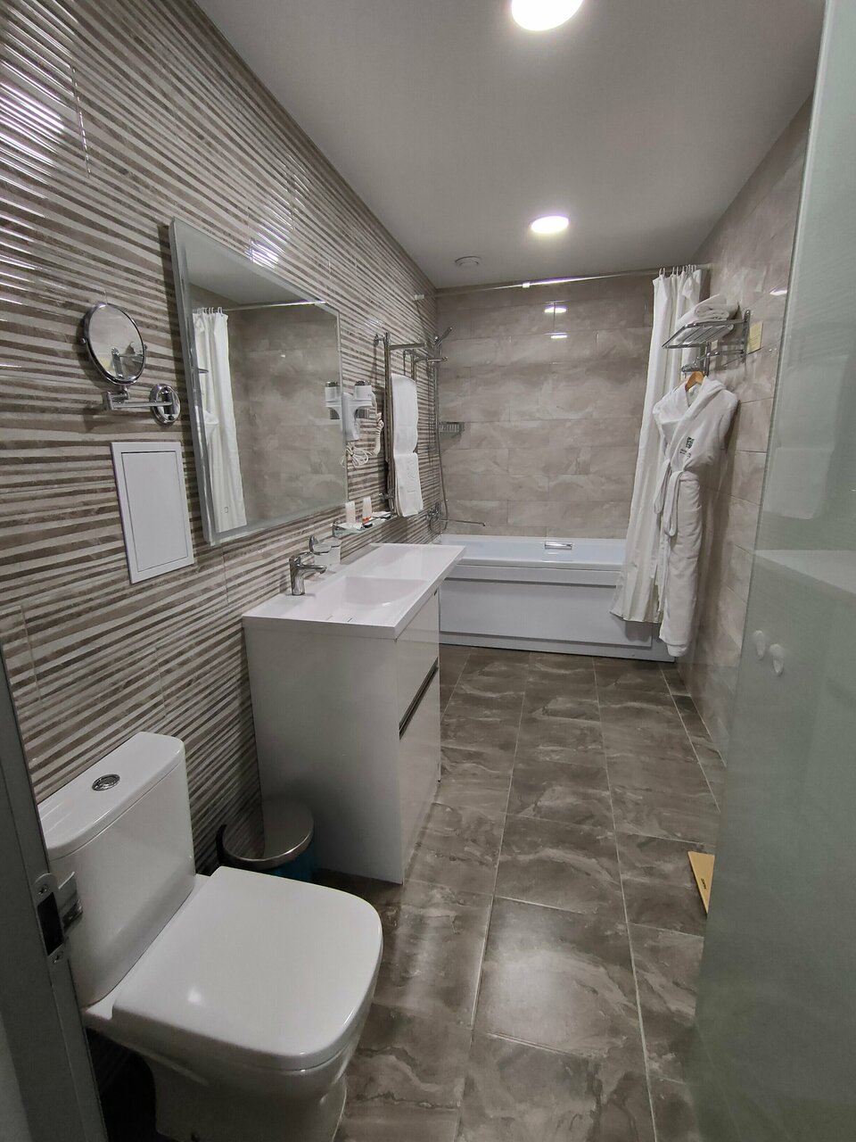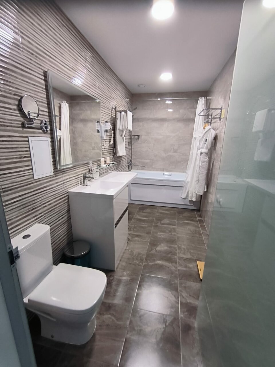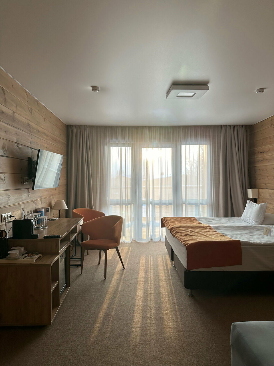 Все очень понравилось. Начиная с номера и заканчивая территорией. Номер приятный, все в дереве, в нем отлично дышится и пахнет.Все средства гигиены есть, халаты, полотенца мягкие и пушистые.Прекрасный шведский стол. Нет огромного разнообразия, но все,что бы вкусно покушать присутствует. Несколько видов мяса, рыбка. Соления, салатики, овощи ,фрукты. Нет лишних невкусных салатов, которые создают массовку, но совсем не съедобные. Завтраки отличные.Вообщем с едой все на 5!Бассейн с выходом на улицу это вишенка на торте))) Так приятно сидеть в горячей водичке, на свежем воздухе. Очень прикольно. Если хочется полноценно поплавать, есть большой бассейн 4-5 дорожек.В каждом бассейне есть сауна. Огромнейшая территория. Мы гуляли поздно вечером. Это сказка. Все освещено, дорожки в лесу широкие, расчищены, везде фонари светят как днем))) мы гуляли в 24 часа и было очень комфортно. Воздух, лес,атмосфера сказочная. Вообщем все прекрасно.