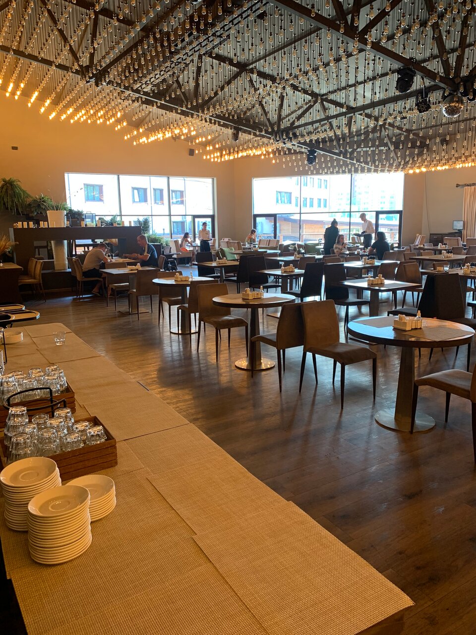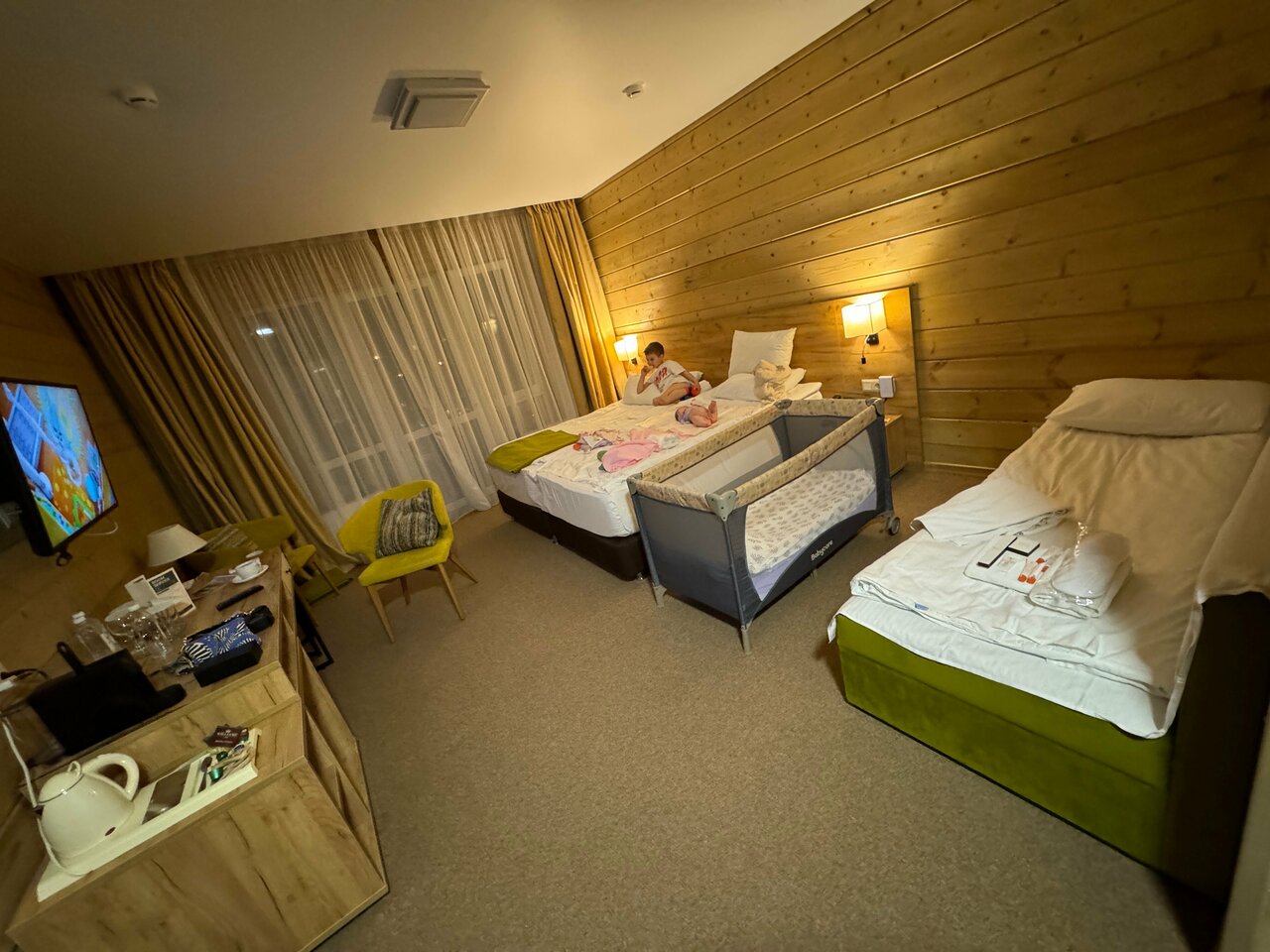 Жили в Спорт отеле, тк на наши даты не было других мест. Брали всё включено. Завтраки хорошие. Из минусов при размещении именно в Спорт отеле: 1. Отдельно стоящий корпус в 600-700м от основной территории. Парковка городская, стихийная. 2. Нельзя на машине заехать на основную территорию (только в день заселения для получения ключей и регистрации). В остальном всё понравилось. Перемещались между локациями не возвращаясь в номер до вечера. Все развлечения в одном месте: СПА, бассейны, каток, большой и настольный теннис, анимация для детей, зоопарк, боулинг, бильярд, сёрфинг, детская комната, летом футбол и подвесная тропа. Питание шведский в ресторане Арена на высоком уровне.