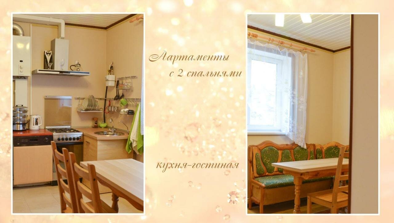 Двухкомнатные апартаменты,с отдельным входом,парковкой,кухня полностью оборудована техникой, сан узел один на две комнаты. Первый этаж. Очень уютно и комфортно,есть все для жизни и отдыха!
