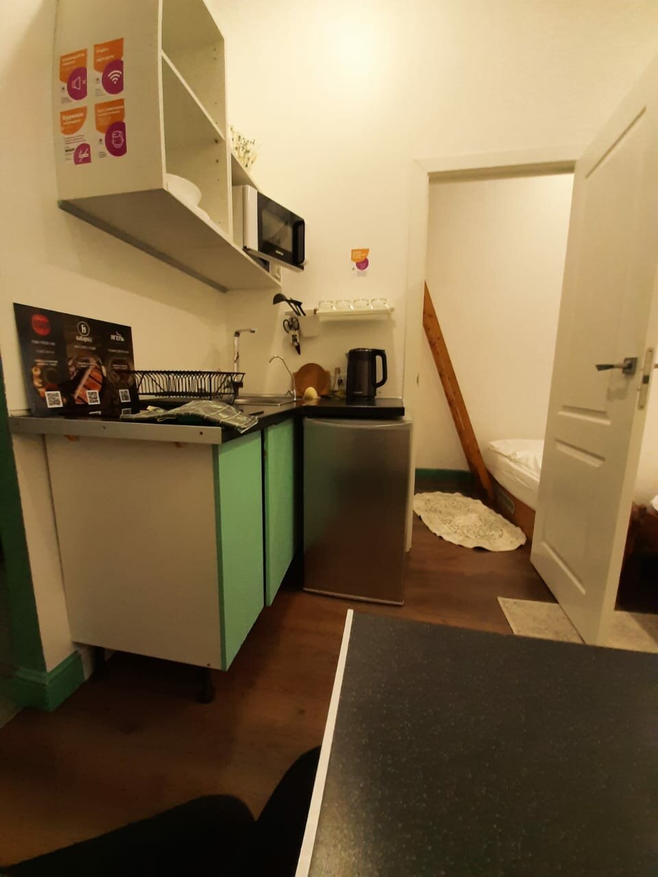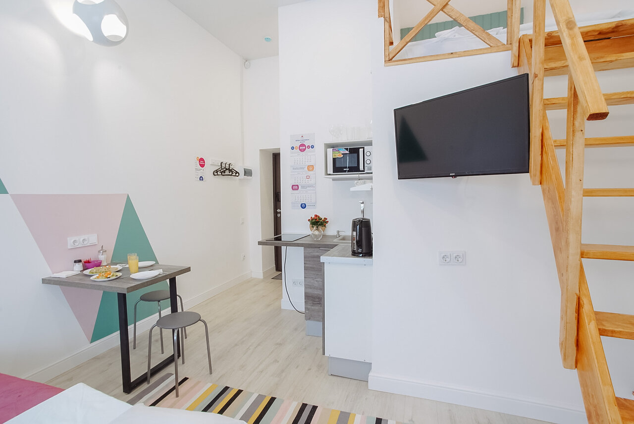 - Чистые, уютные и комфортные номера.; Двухуровневые номера (особенно нравится детям).; Отличное расположение (историческое место, центр города, близко к паркам, реке, достопримечательностям).; Есть кулер на этаже.; Всё необходимое для проживания (кухня, посуда, чайник, полотенца и т. д.).