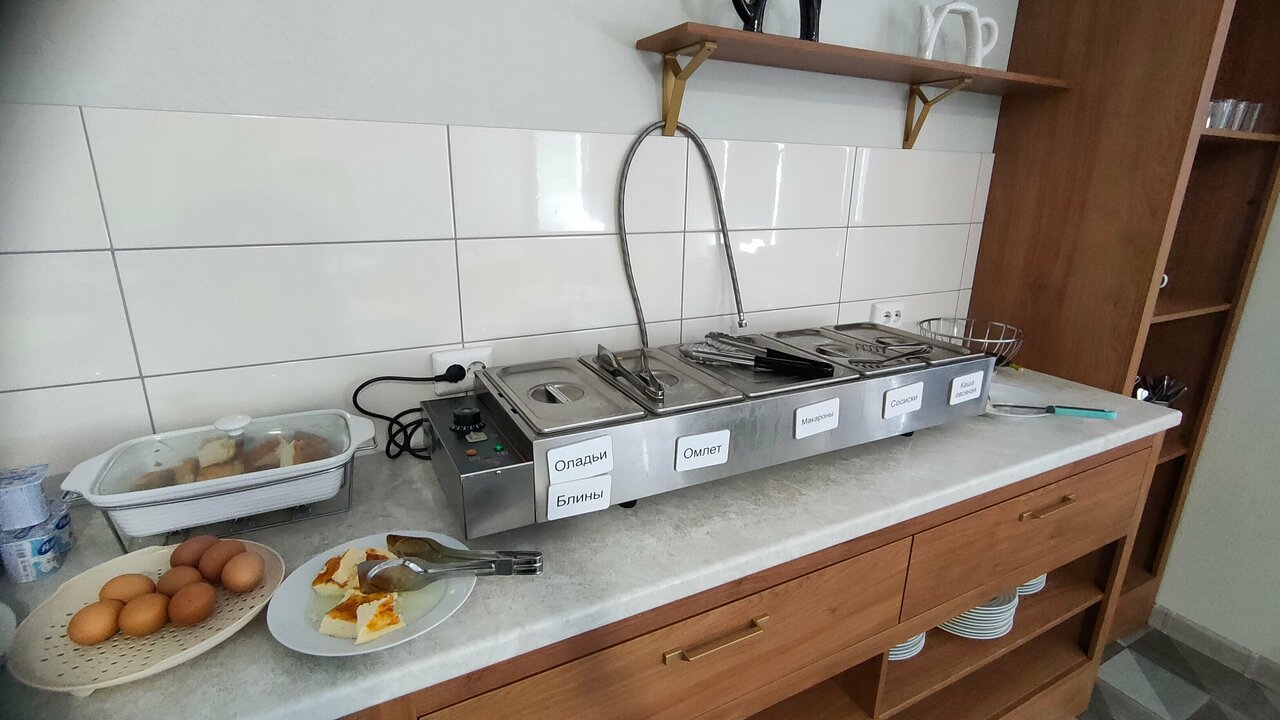 Твердая тройка. Удобное расположение. За 15-20 минут можно дойти до набережной. Рядом магазин Магнит. Номера небольшие. Между двумя кроватями только 1 розетка, вторую нашли под столом. На столе чайник, две чашки, 2 стакана и блюдца. Есть фен и фумигатор. Холодильника нет. На завтрак предлагается овсяная каша, отварное яйцо, омлет, сосиски или нагетсы, макароны, творожная запеканка, блины, йогурт, нарезка из колбасы и сыра , чай, кофе, морс.