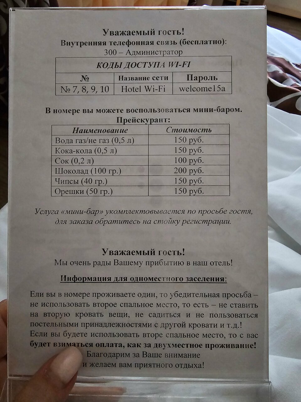 Отель забронировал работодатель по командировке, все +- известные гостиницы на нужные даты были заняты, был приятно удивлен,Просторный номер с кондиционером, большим телевизором и просторной душевой, рекомендую. Такси до центра утром 177р