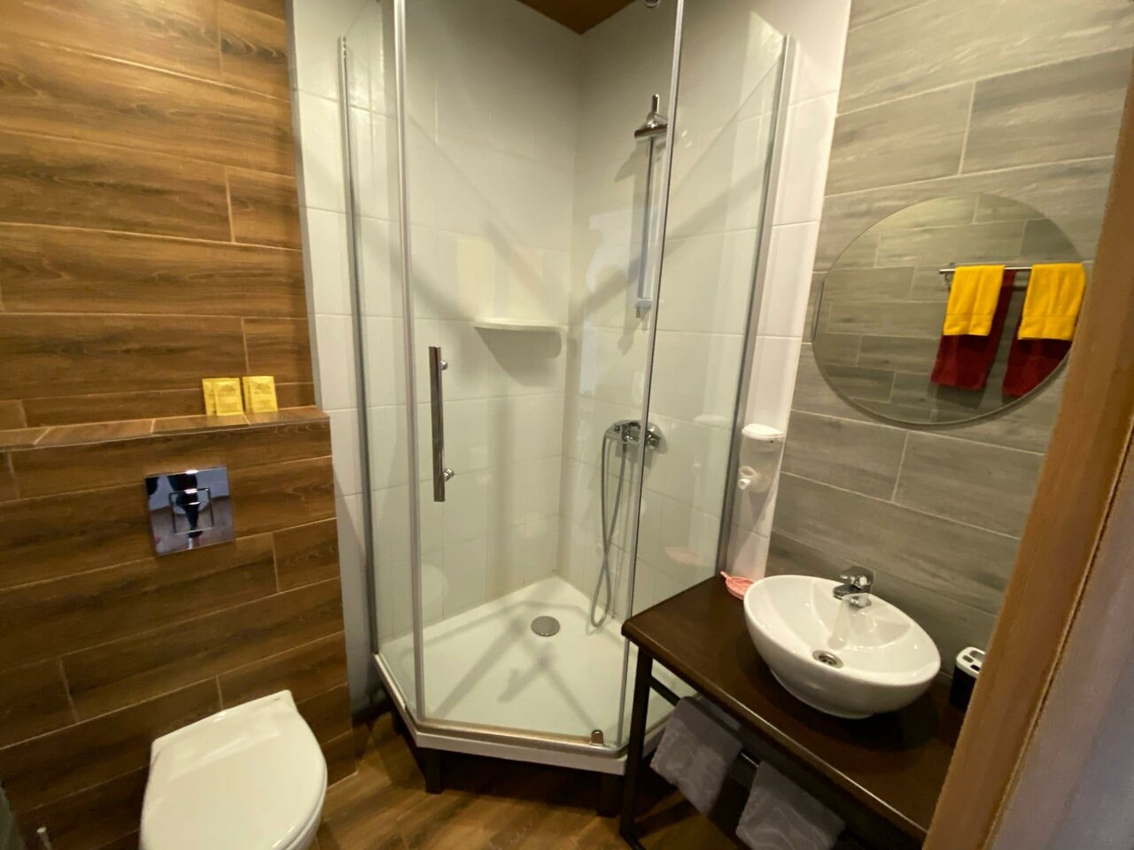 Выдали номер гораздо больше забронированного, видимо вышла накладка. Мы были не в обиде, но вот неработающий душ расстроил ( Наутро сказали администратору, вечером вернулись — душ так и не работает ((