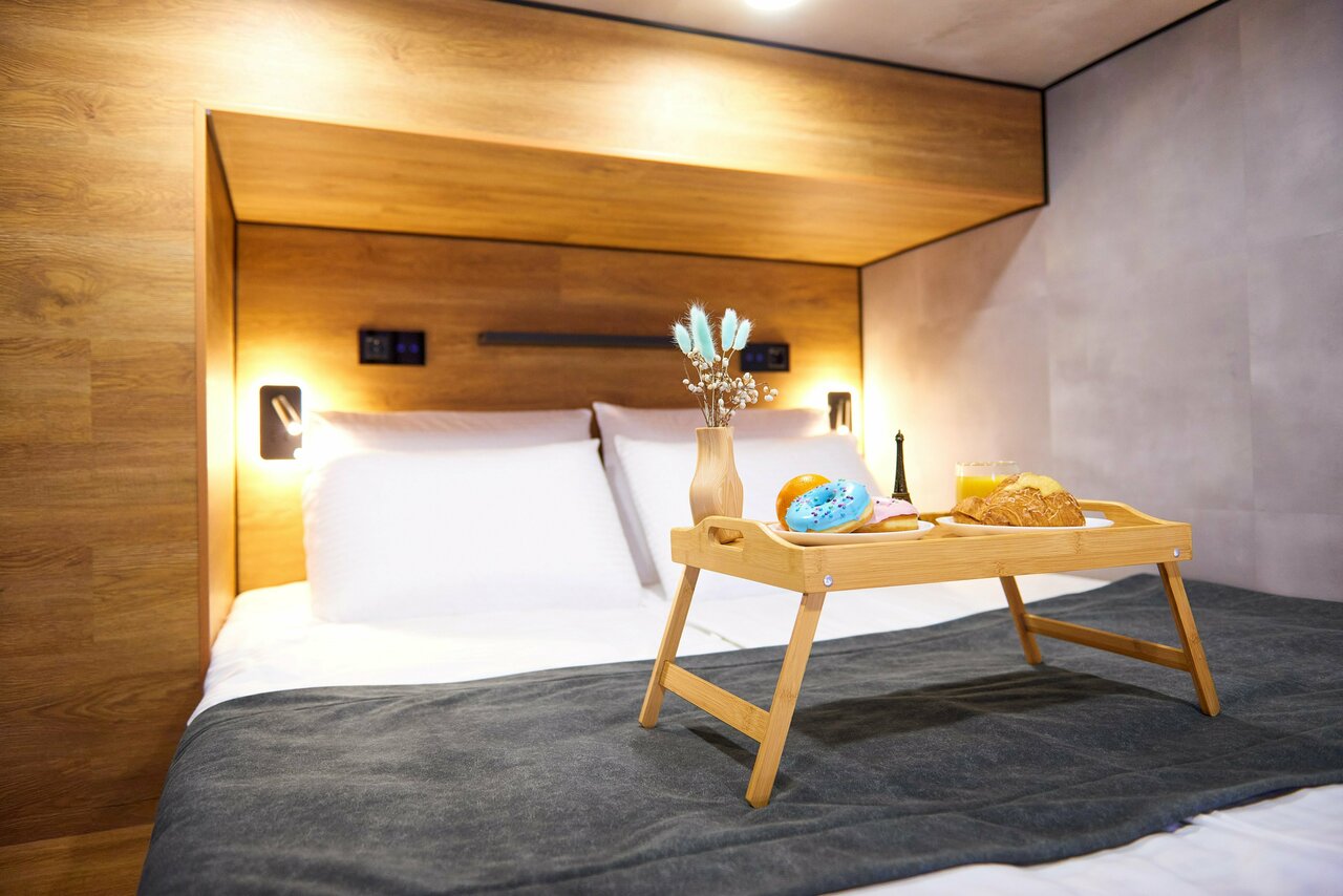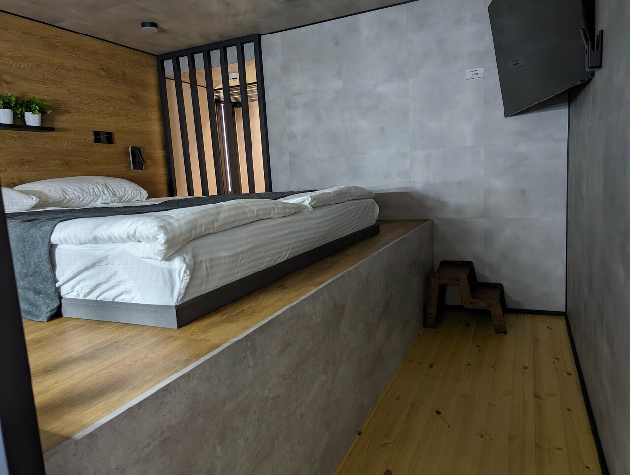 Очень интересное решение, мне зашло. Но! Есть некоторые моменты, которые хотелось бы доработать: 1. Лампы над кроватью. В номере установлены сенсорные выключатели, все классно, но нужен конденсатор. Все ночь лампы именно над кроватью мигают, моргают. 2. Высота подиума. Слишком высоко (см 70, наверное). Да, заботливо поставлена скамейка. Но ночью в темноте толком не видишь эту скамейку. 3. Вентиляция. Нужна приточная вентиляция. Если окно закрыто, через пару часов просто нечем дышать. В остальном — прекрасно, современно, стильно, очень технологично. Удобное расположение. С парковкой вроде бы и неплохо, но далековато ставить (на площади, переходить через 2 светофора, тк ближайшая стоянка всего на 4 места и достаточно часто полностью заполнена)