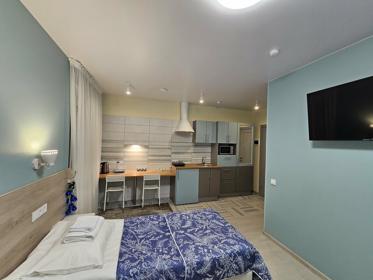 Номер чистый, глаз радует, в номере все есть для уютного пребывания. Интернет, телевизор, мини кухня. Парковка отдельная закрытая все под видео наблюдением за машину не переживала. И за все это цена — СУПЕР. Всем советую.