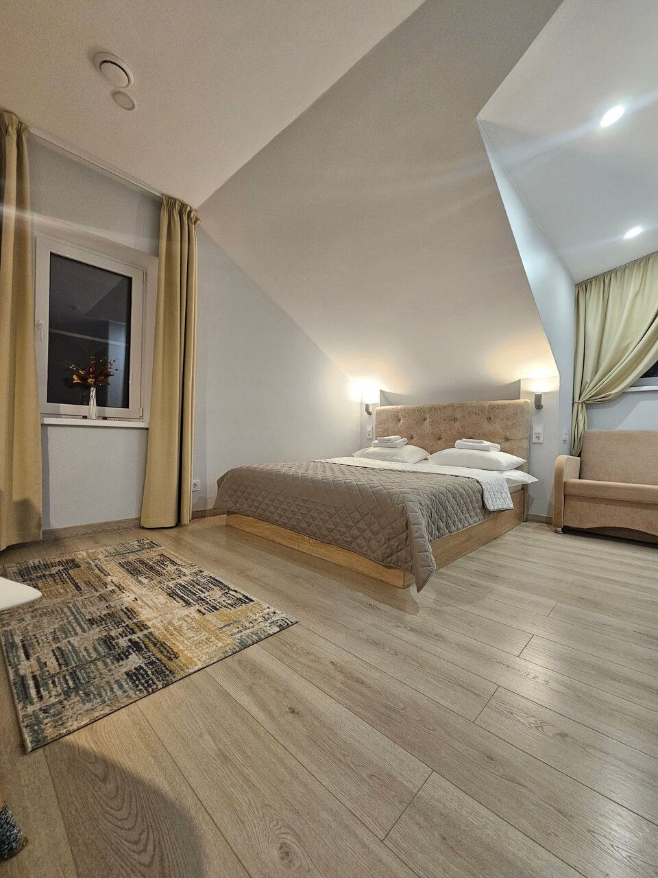 Шикарная гостиница. Большая собственная парковка. Номера с собственной кухней очень свежая и качественная отделка. Приятная хозяйка. И всё это недорого.